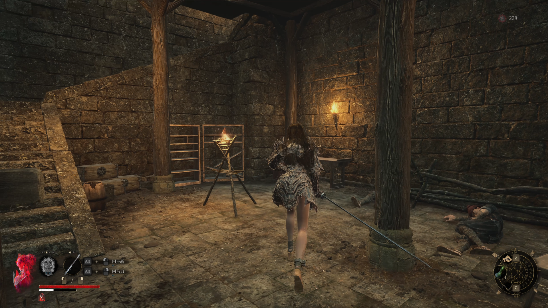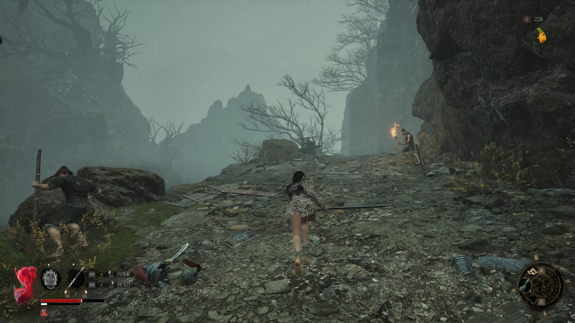 继续往前走,会遇到一名持长矛的明军士兵。这个敌人的攻击看似简单,但他的突刺攻击判定比较“玄学”,有时明明已经闪避开了却还是会被命中,容易被连续打出硬直,甚至被击退到墙角挤死。尤其是在这里,地形较为狭窄,周围怪物又多,很容易被围殴。建议尽量用远程或牵扯的打法,耐心引怪逐个击破,千万不要硬拼,避免造成不必要的损失