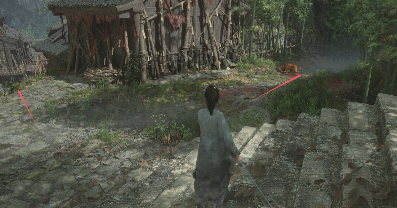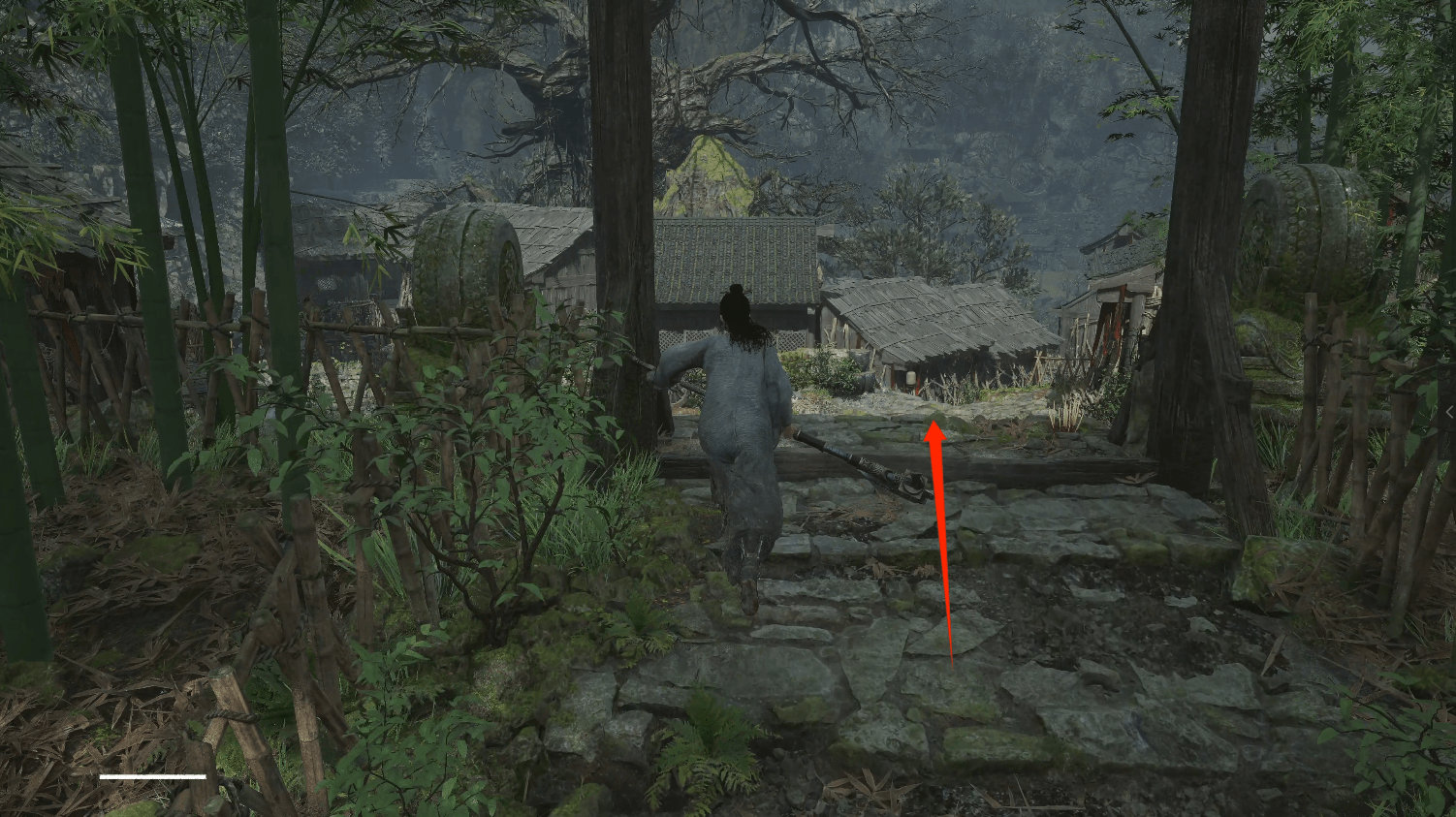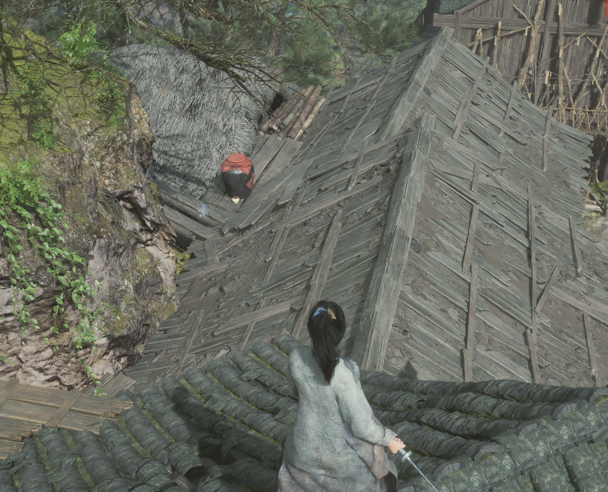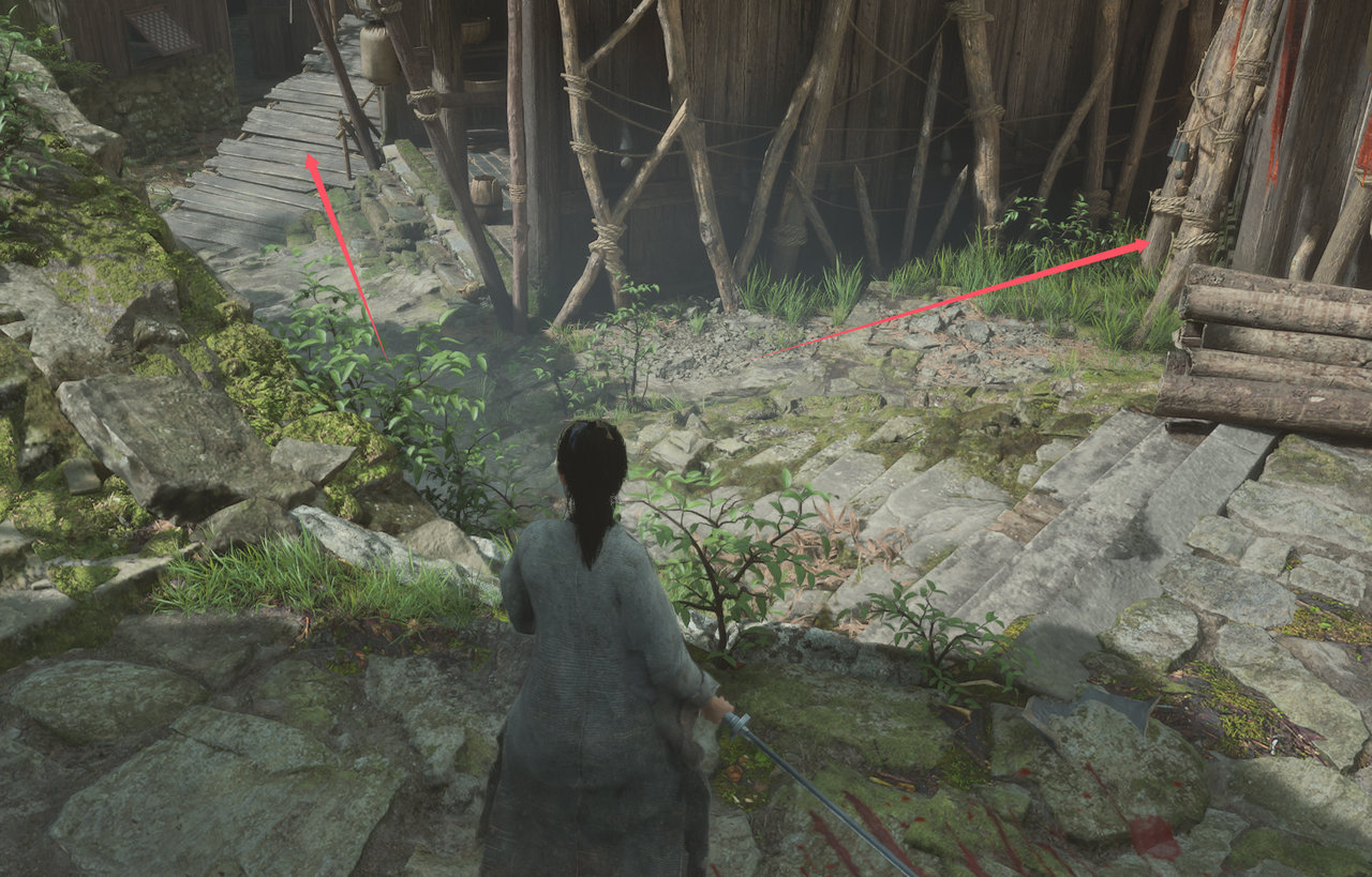 爬上梯子绕一圈房顶,酒缸左边藏了个大刀哥,打完这里捡火硝爆弹*2,然后可以原路下梯子走上图左边那条路了。