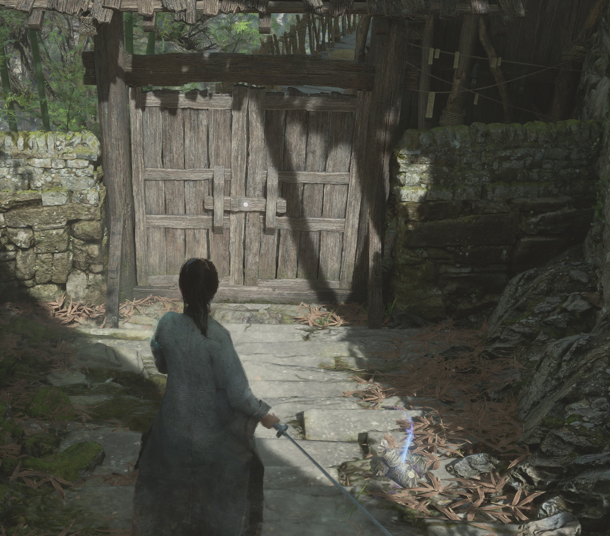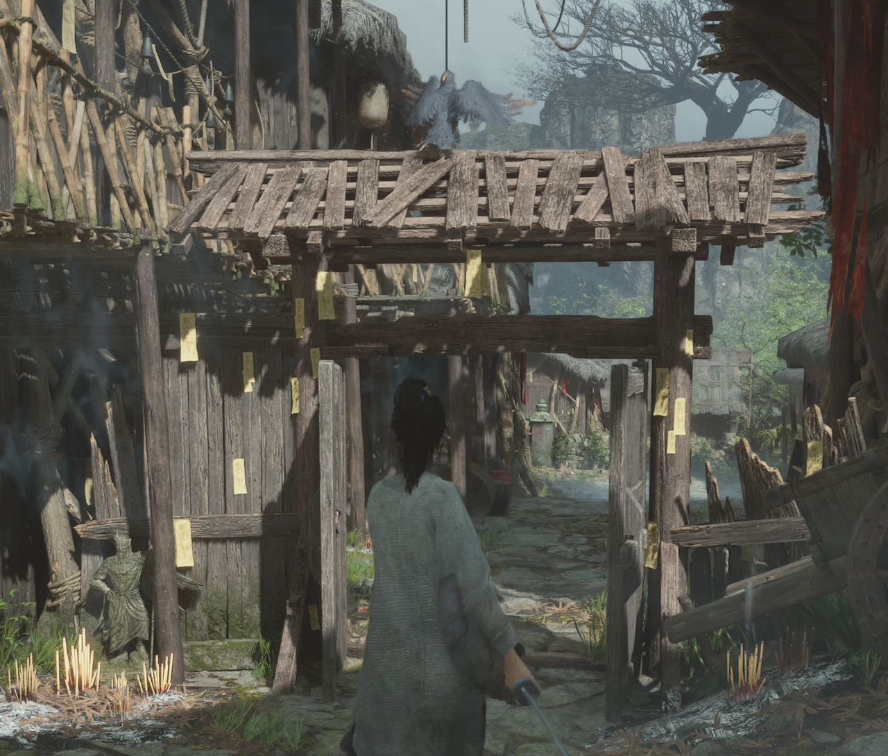 击败敌人沿着木台阶向下,岔路口左侧箭头处是通往唐王行宫的捷径,大门旁边帐篷处拾取【羽珠*1】,目前无法解锁大门捷径。右侧箭头木棚下可以找到玄阳子对话,告诉我们唐王行宫禁止通行,需要走蜀王祠下的密道去秽柳滩,玄阳子身后木棚内部拾取【火硝爆弹*3】。