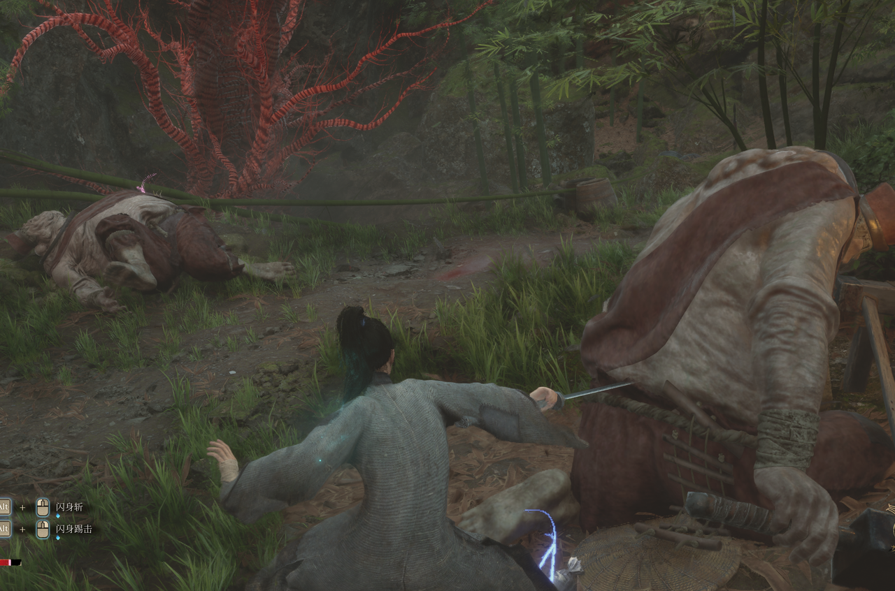 如果先往右边走,有两条狗,能捡到【飞刀*3】,两个巨人,一个坐着,一个持续游走,建议逐个击破,获得【黯淡红羽*1】【生长的赤汞*1】【新生的赤汞*1】,再往前一些能开通往蜀王祠的近路。