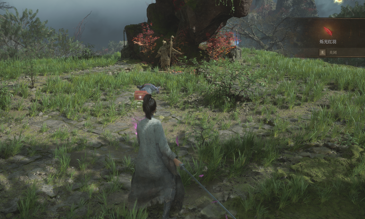 继续向前,在关公像前会有一个双刀精英怪,这个怪物强度比较高且能对玩家的招式弹刀,还是老样子用绕背击破,击败后获得【烁光红羽】,地上的红箱子里是【未·无伤·猛攻*1】