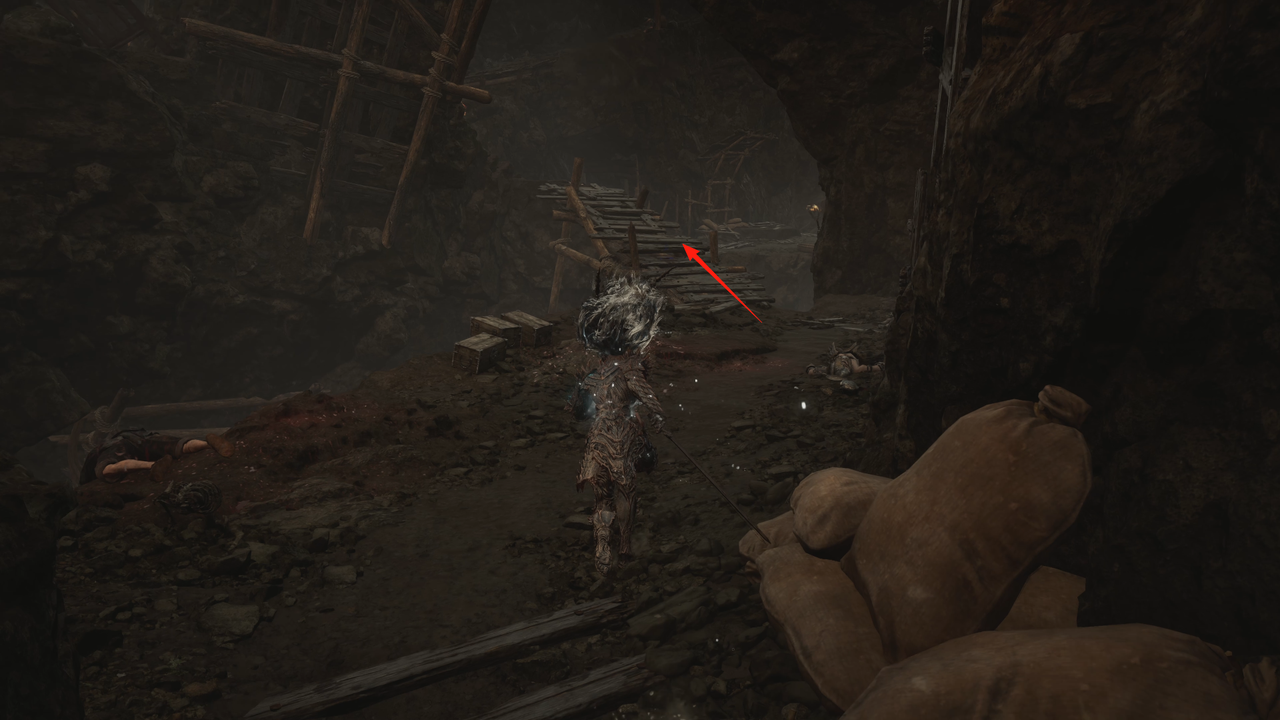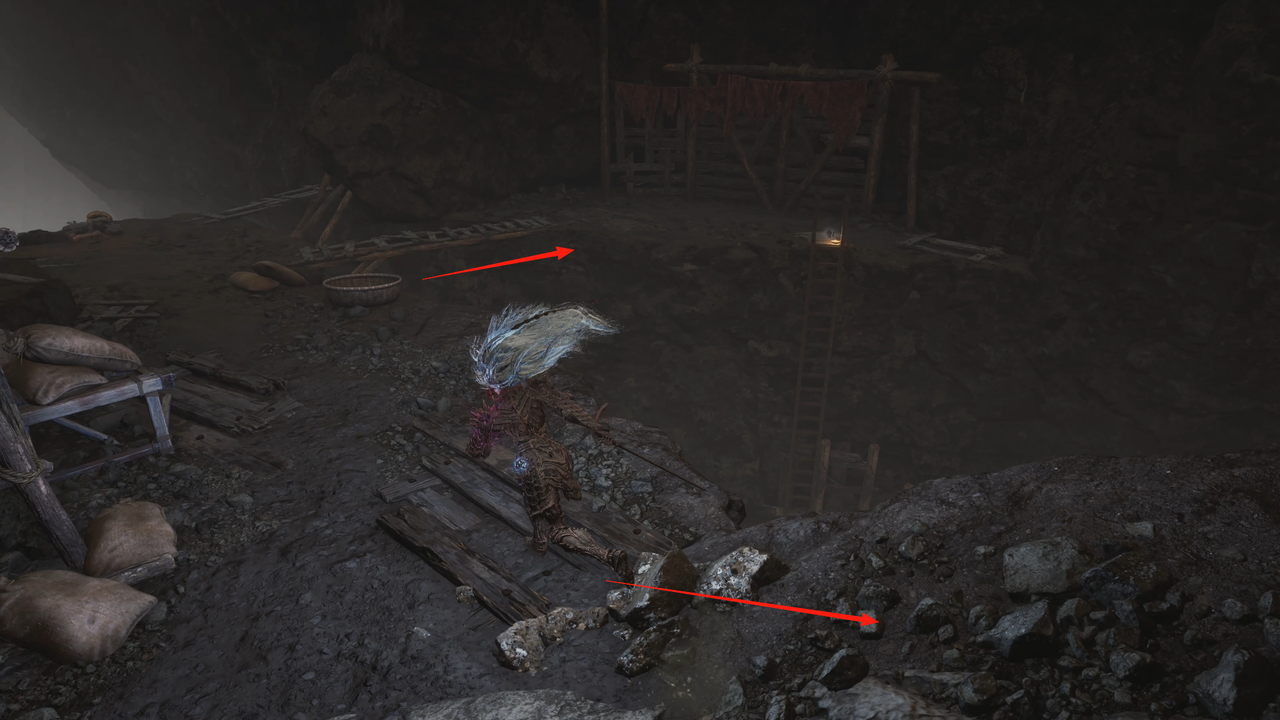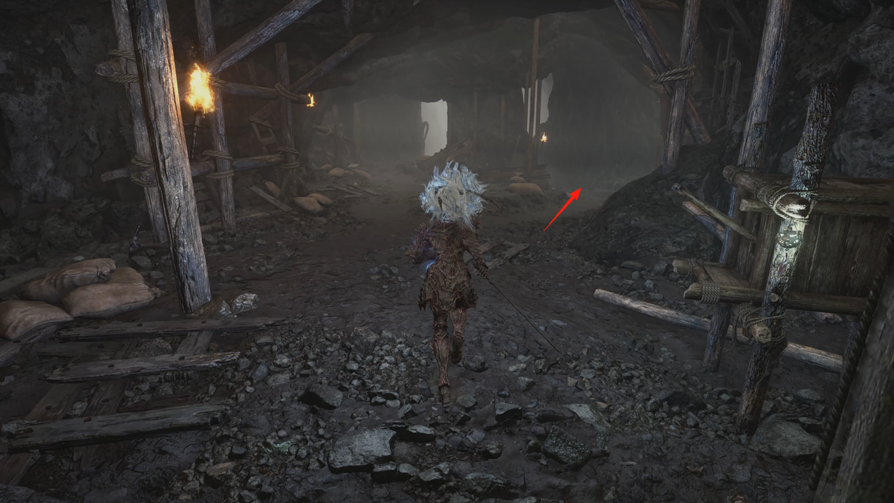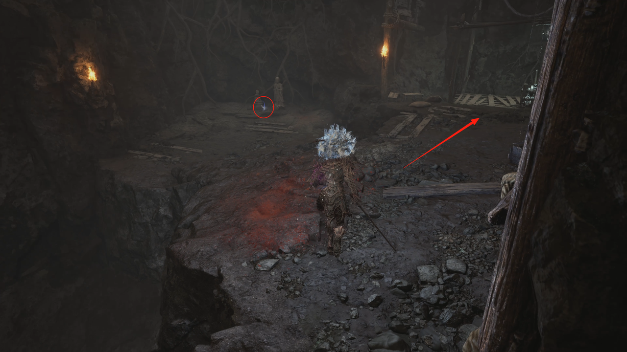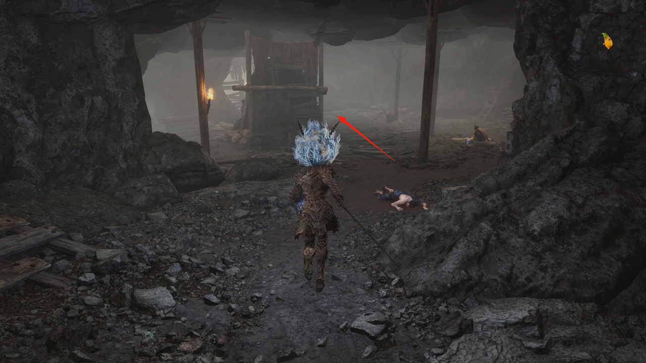 这里从左侧的小门出去,出门后右方矿洞是主路,我们先左拐尽头拾取【黯淡红羽】,随后进入矿洞。