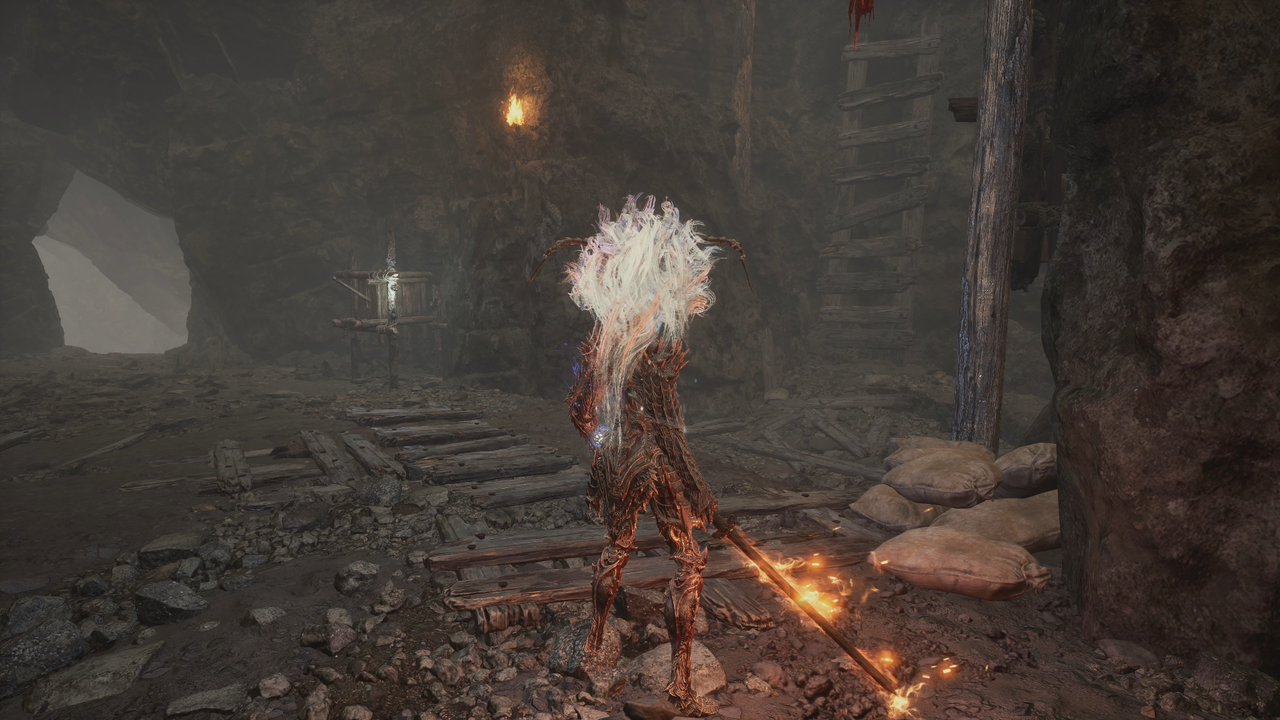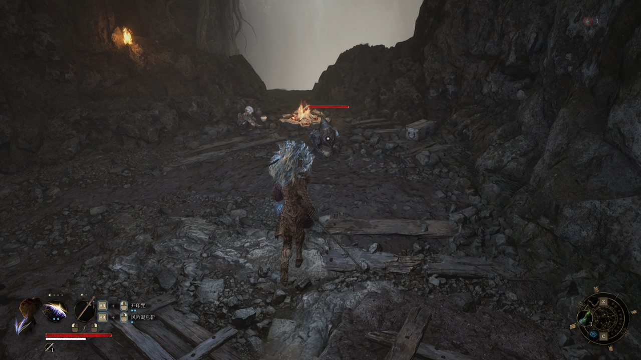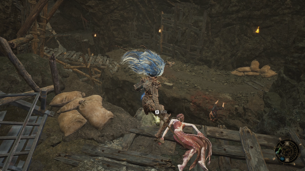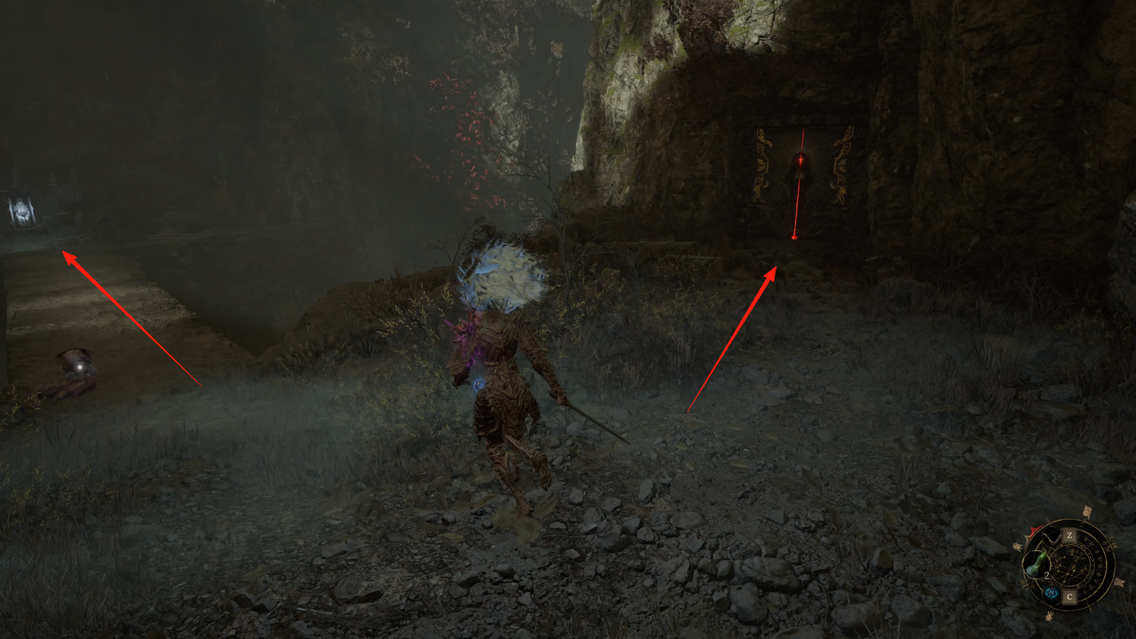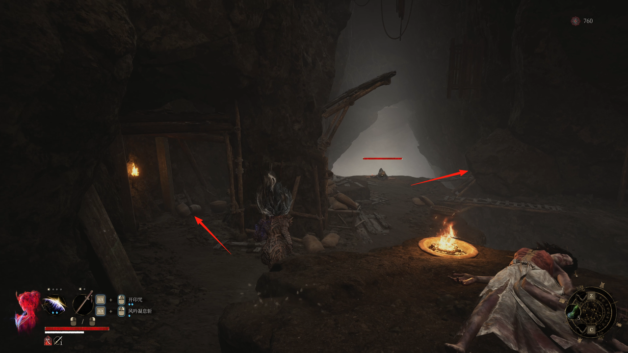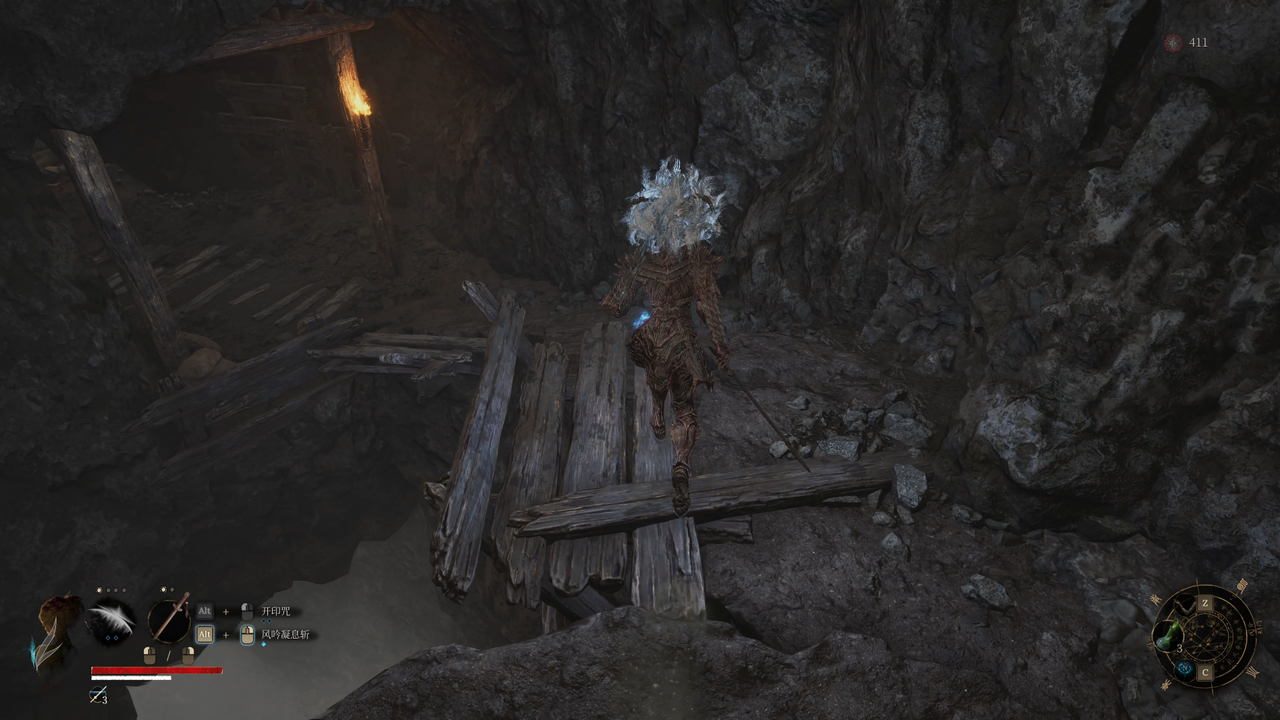 这里从左侧的小门出去,出门后右方矿洞是主路,我们先左拐尽头拾取【黯淡红羽】,随后进入矿洞。