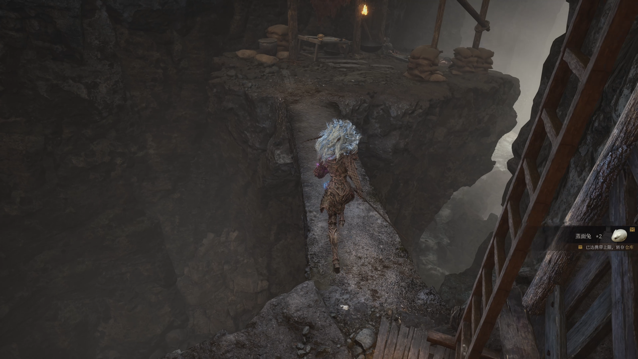 从身后的箭头往上走可以捡到【蒸面兔*1】,随后去右侧从梯子下去