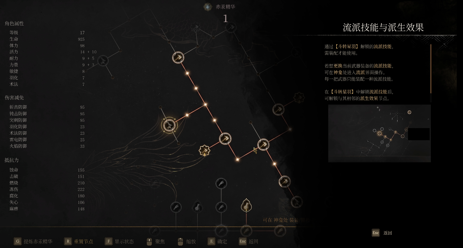 战斗中熟练使用各种武器和流派技能,合理运用法术可以大幅提升伤害,赤汞就是游戏里的“魂”,那【赤汞精华】即是无常的技能点,可以提升无常属性,学习流派技能,合理运用可以让我们在战斗中游刃有余。战斗中击败敌人可以获得赤汞,在神龛处拜命选择【斗转星羽】即可消耗赤汞提炼【赤汞精华】用于解锁属性以及武器特性。游戏中的5种武器除了长枪有6个流派技能以外,长刀、巨斧、双刀、单手剑都只有5个流派技能,每个流派技能都可以通过联通与之相邻的技能点获得额外的效果。