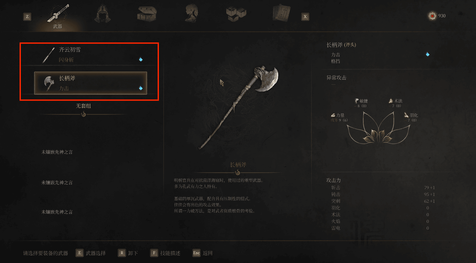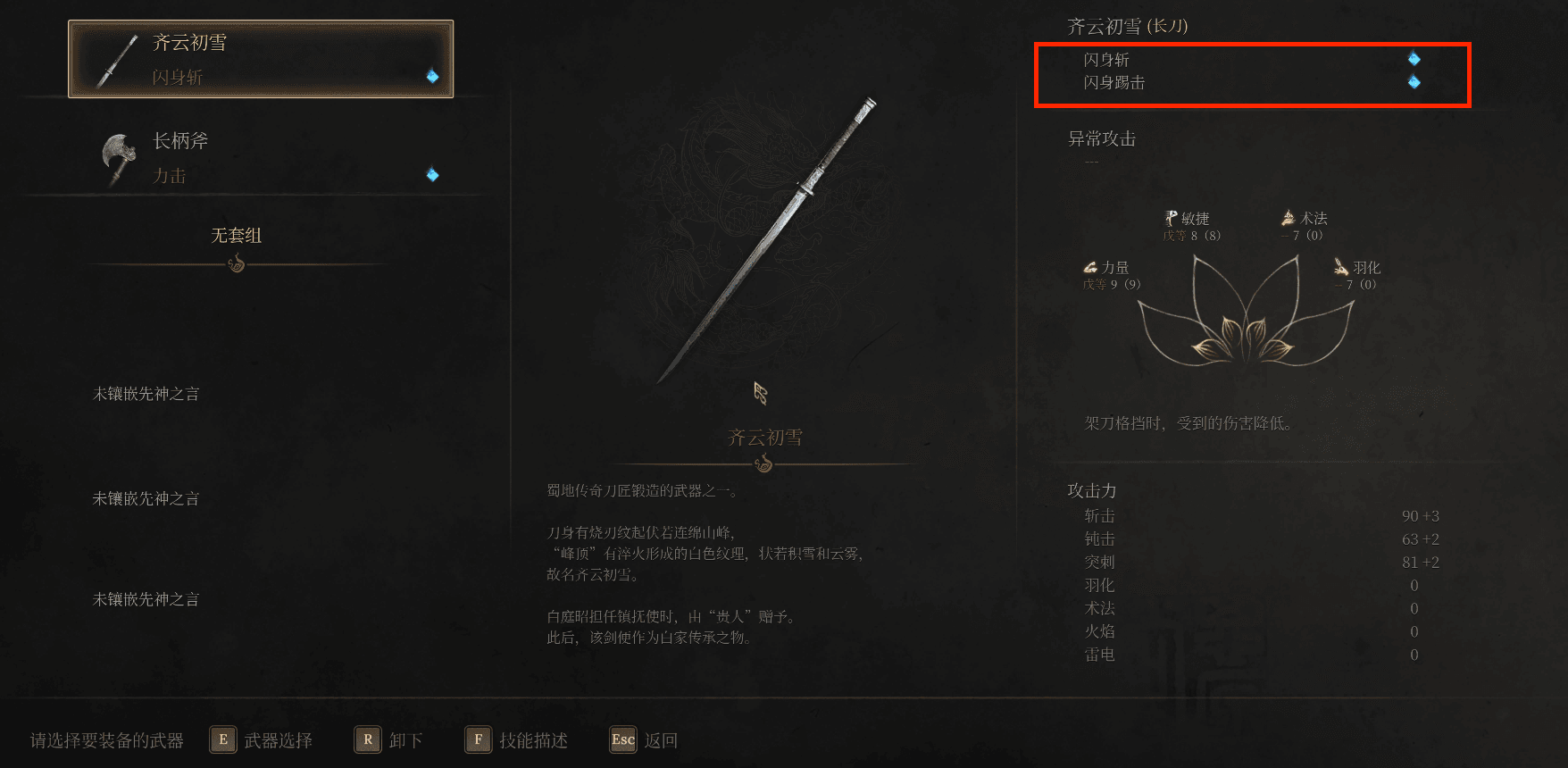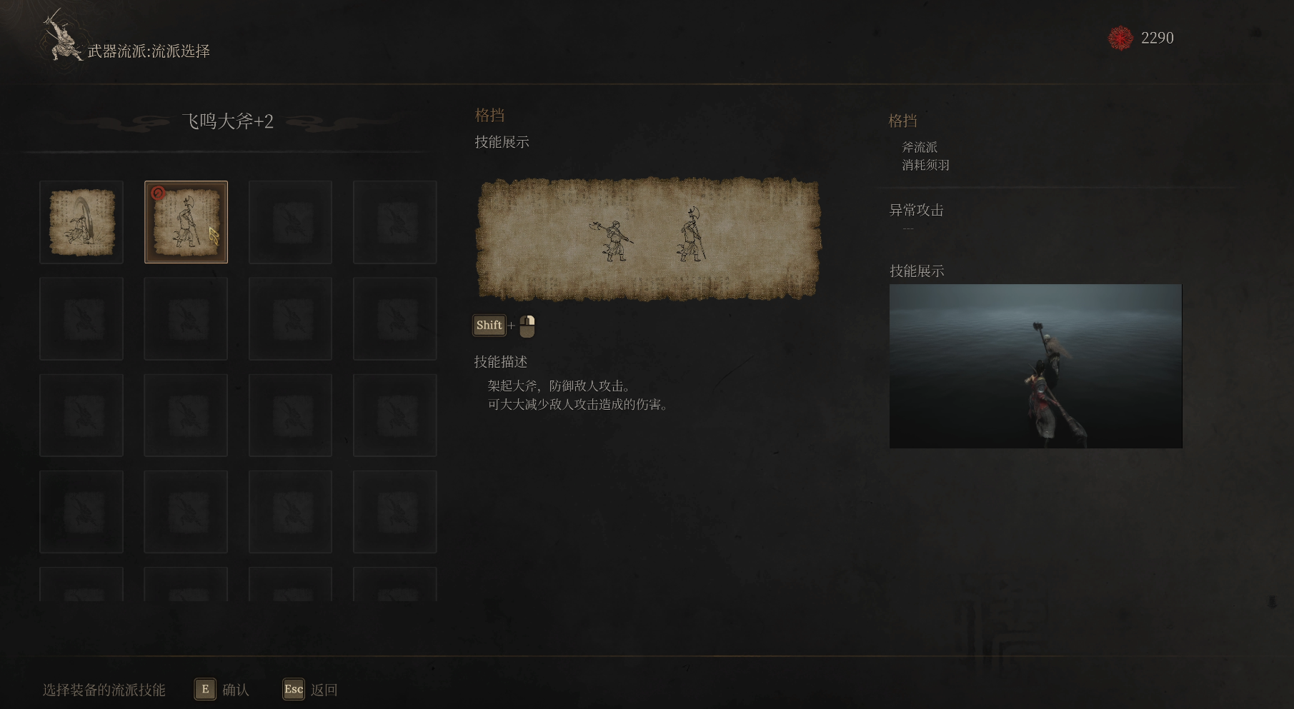 ALT加鼠标左键(xbox手柄LB PS手柄L1)可以释放武器技能,每个武器各自独特的武器技能,可以在ESC中装备界面查看。在物品界面左上角也可看到装备的不同武器的武器和流派技能以及消耗的须羽。无常最开始须羽上限只有一,可以在【斗转星羽】中增加须羽上限。须羽不足时释放技能会大打折扣。