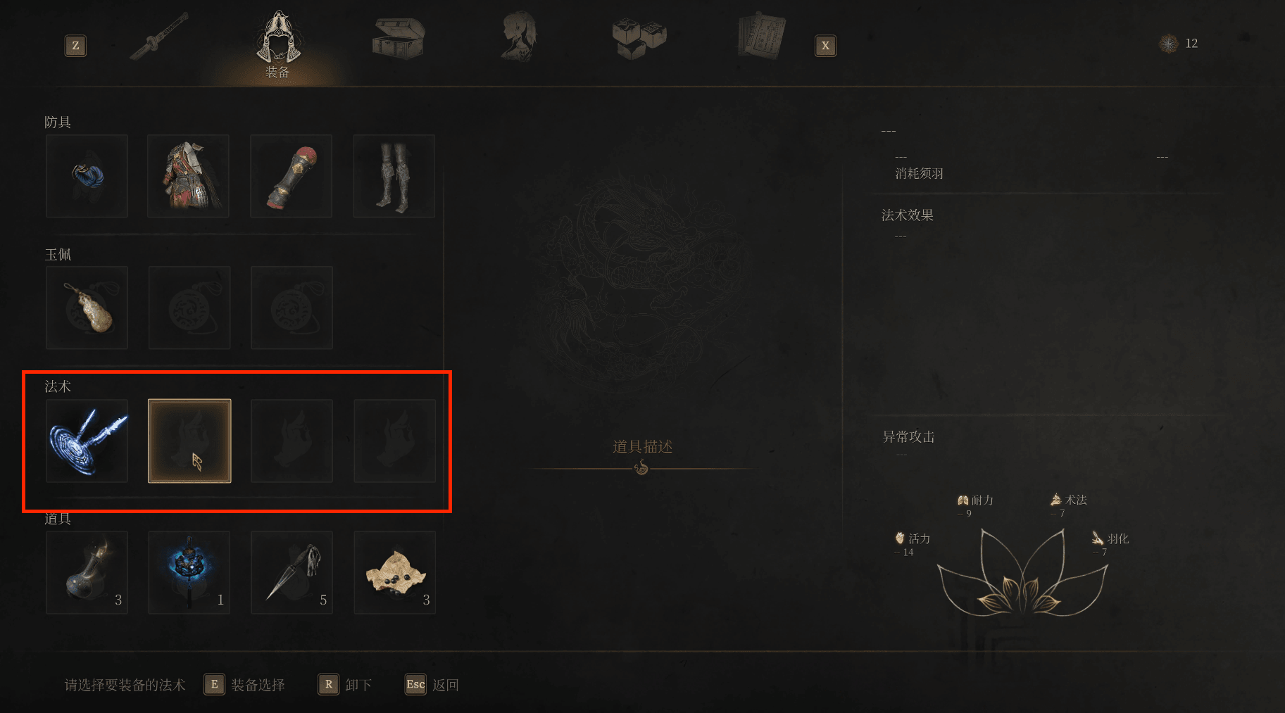 在角色装备界面可以调整法术,装备或卸下已持有的法术,同时也可以在这里看到各种法术效果,装备法术后可以在左下角看到当前法术。按G(xbox手柄按Y PS手柄按△)可以消耗须羽使用法术,按V(手柄按下左侧十字键左键)可以切换到下一个已装备的法术。长按施法键然后按L1 L2 R1 R2(RB RT LB LT)可以快速释放法术 。