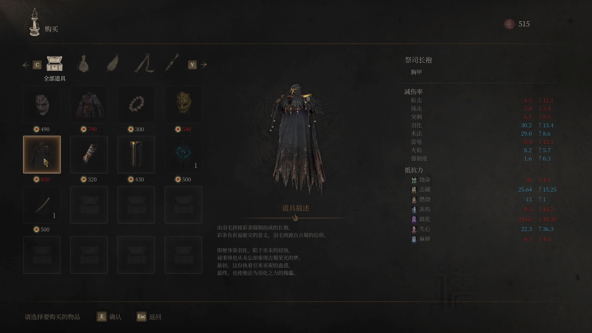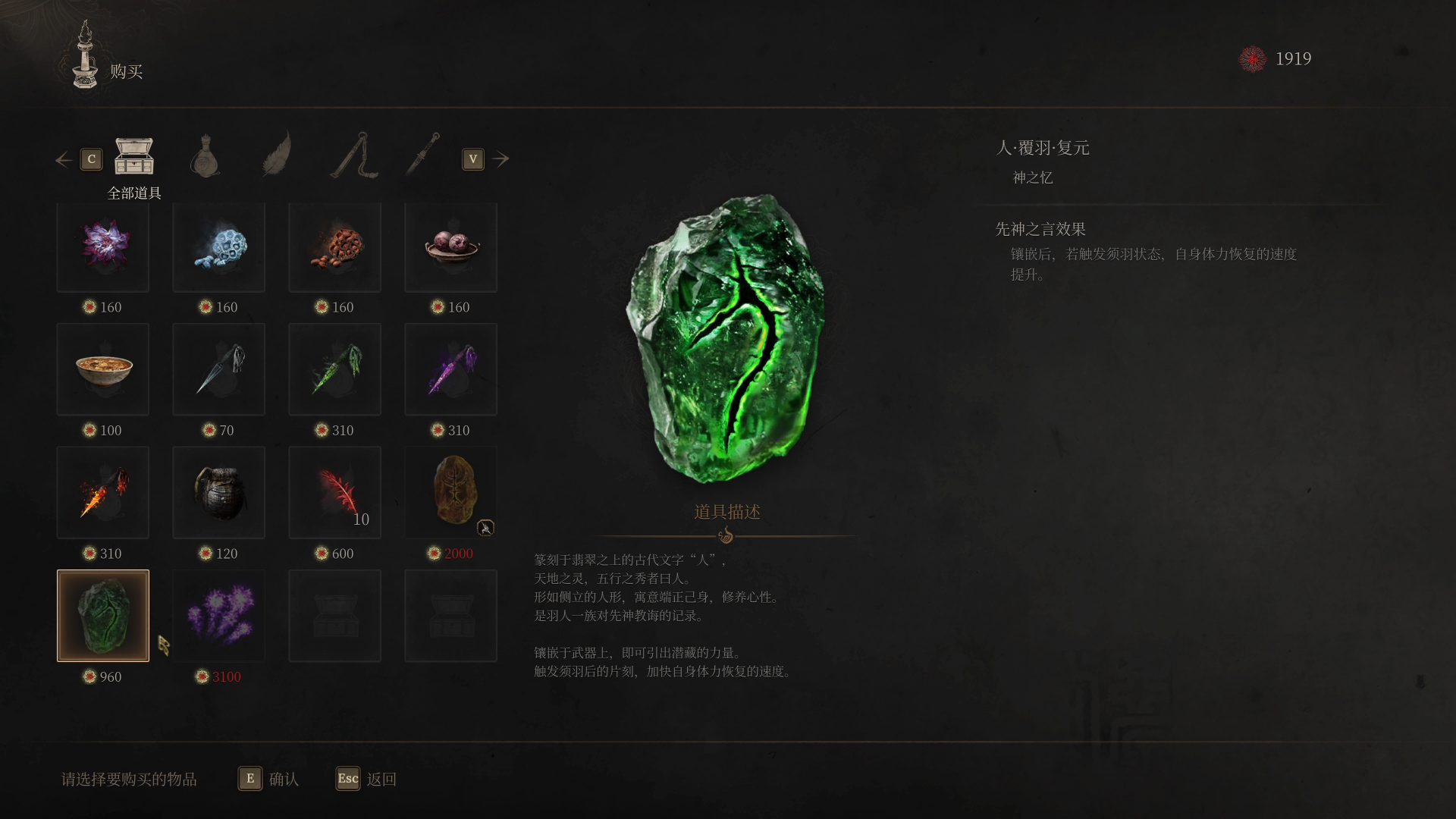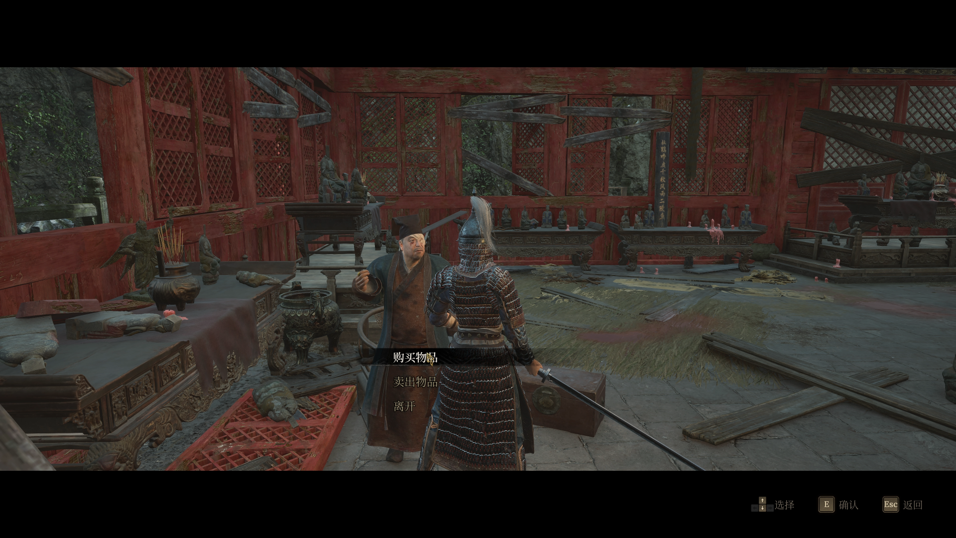 在游戏中将会出现两位商人,他们会在游戏的各个节点出现为我们提供补给,随着剧情的推进他们出现的位置也会随之变化。第一位商人是吴刚,他主要出售各类消耗品及部分先神之言和法术。在流程中将捡到的非boss信物交给他,商店内便会新增对应的物品