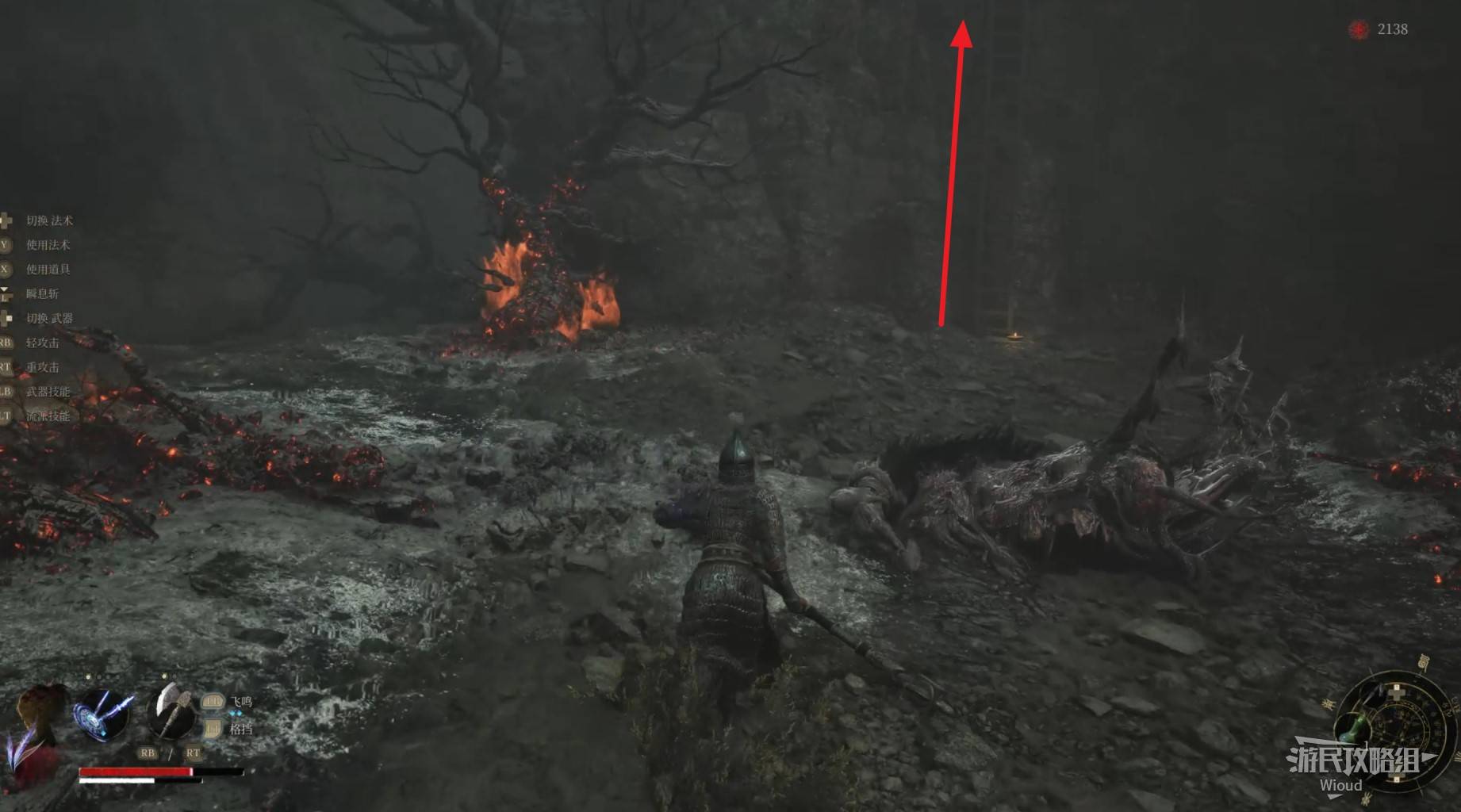 路口直接右拐,沿路走到头,遇到一个马匹怪物,将其干掉后爬尽头的梯子到上层。