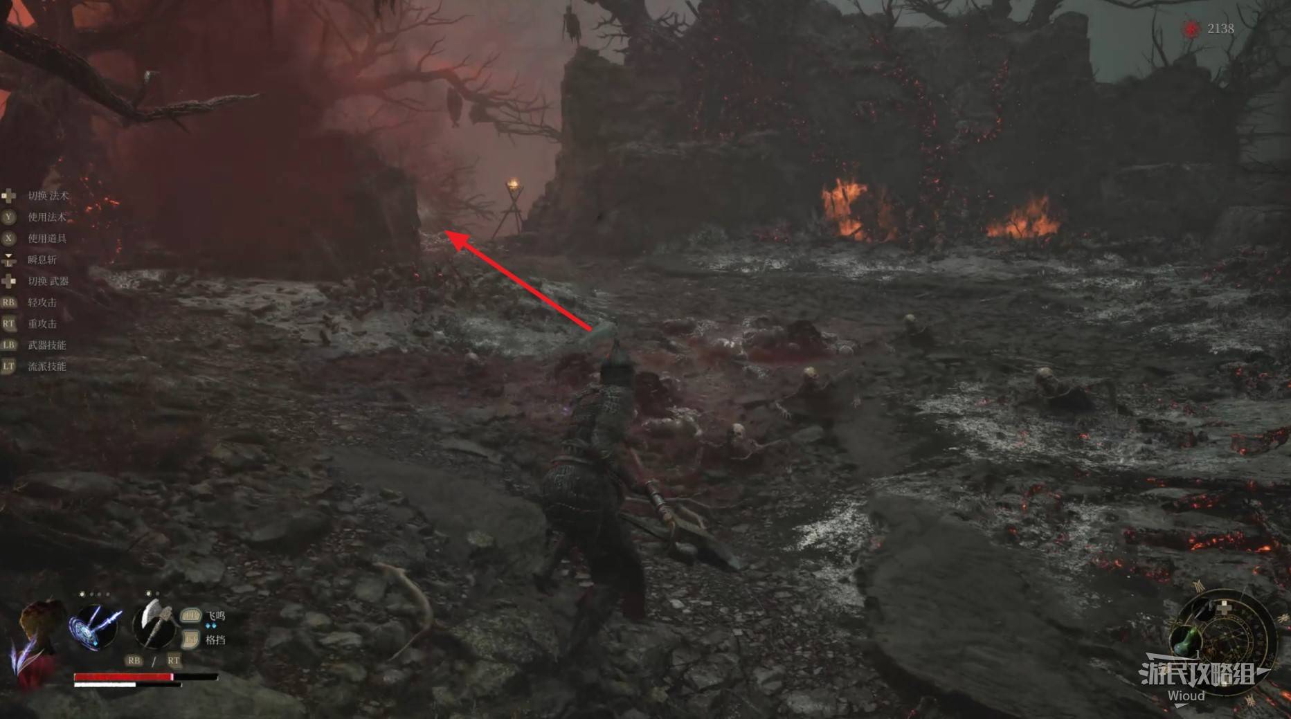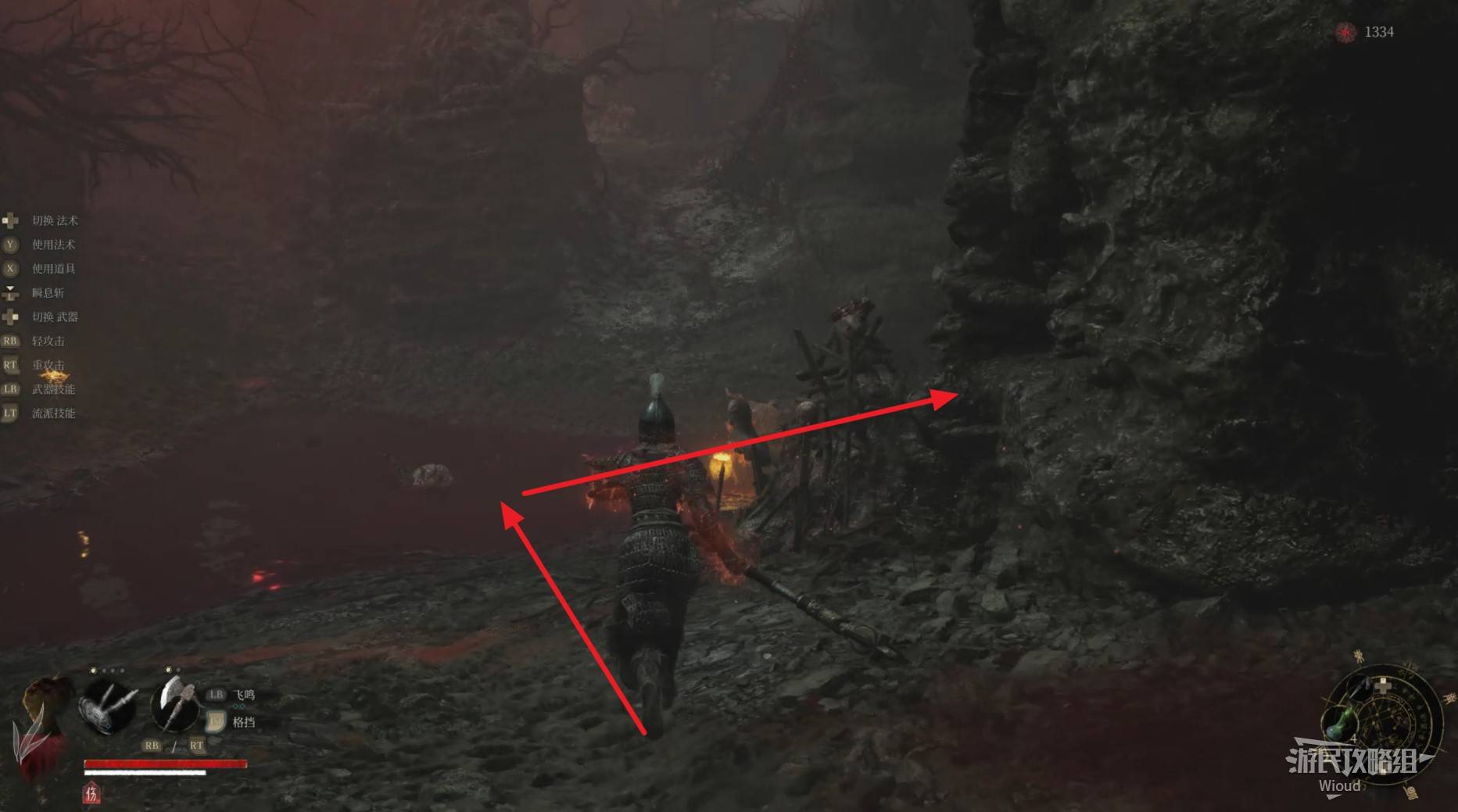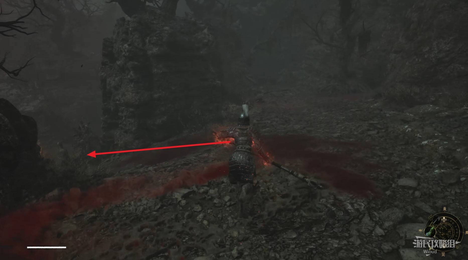 路口直接右拐,沿路走到头,遇到一个马匹怪物,将其干掉后,左侧悬崖紫色发光点可捡到一个黯淡红羽。