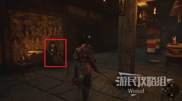 第一次出现在【含光禅院】的神龛左边,面对神龛与左边躺着的吴刚对话,但这里还无法解锁商店功能。