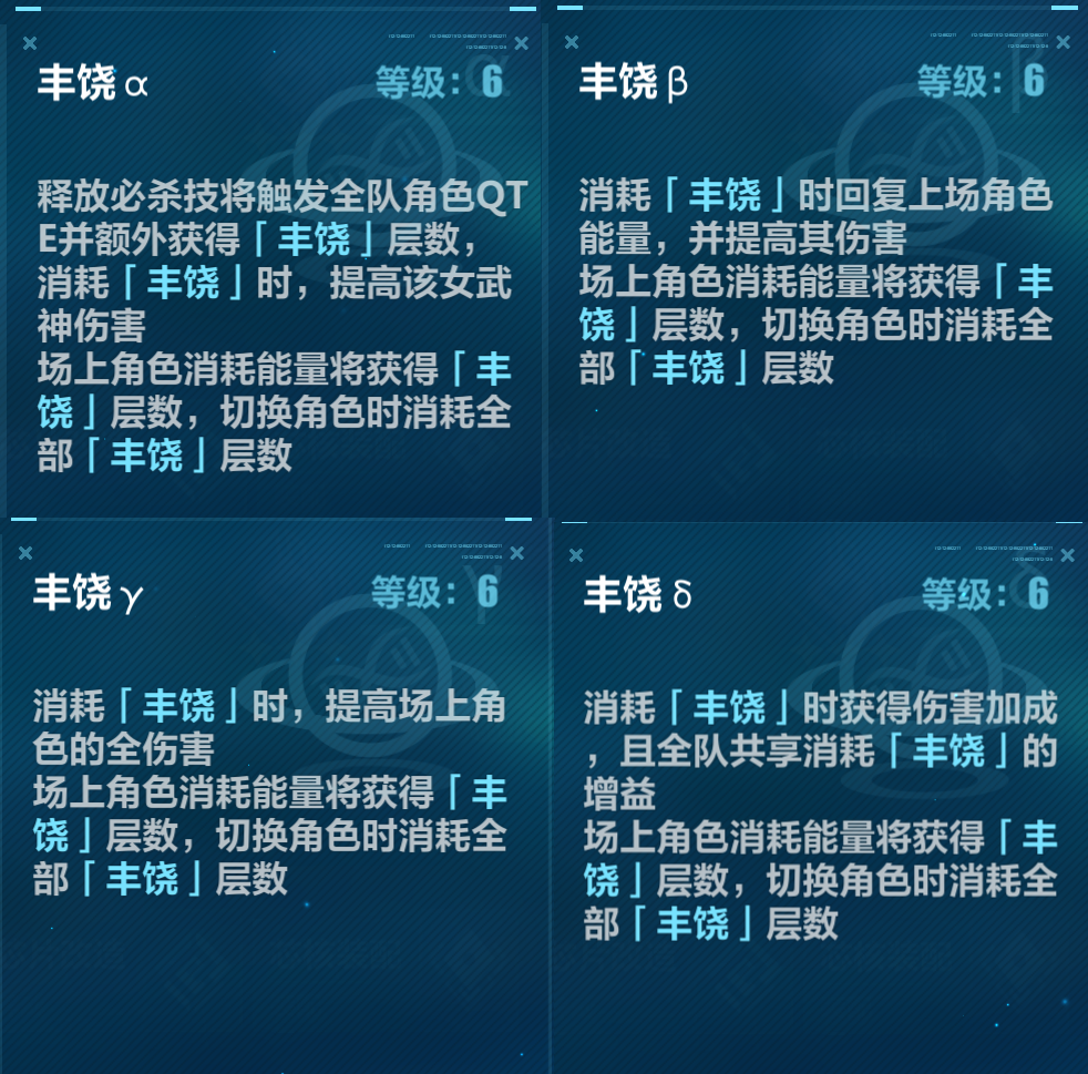 可以根据自己的队伍情况从两种方向去选择芯片,若是每个角色都拥有不短的驻场时间,且每次登场都会消耗能量,使得「丰饶」层数到达40层,则可以选择α(必杀技触发QTE)、β(消耗丰饶回能)、γ(消耗丰饶增伤)的组合,使每名角色在登场时都可以获得「丰饶」的增益。
