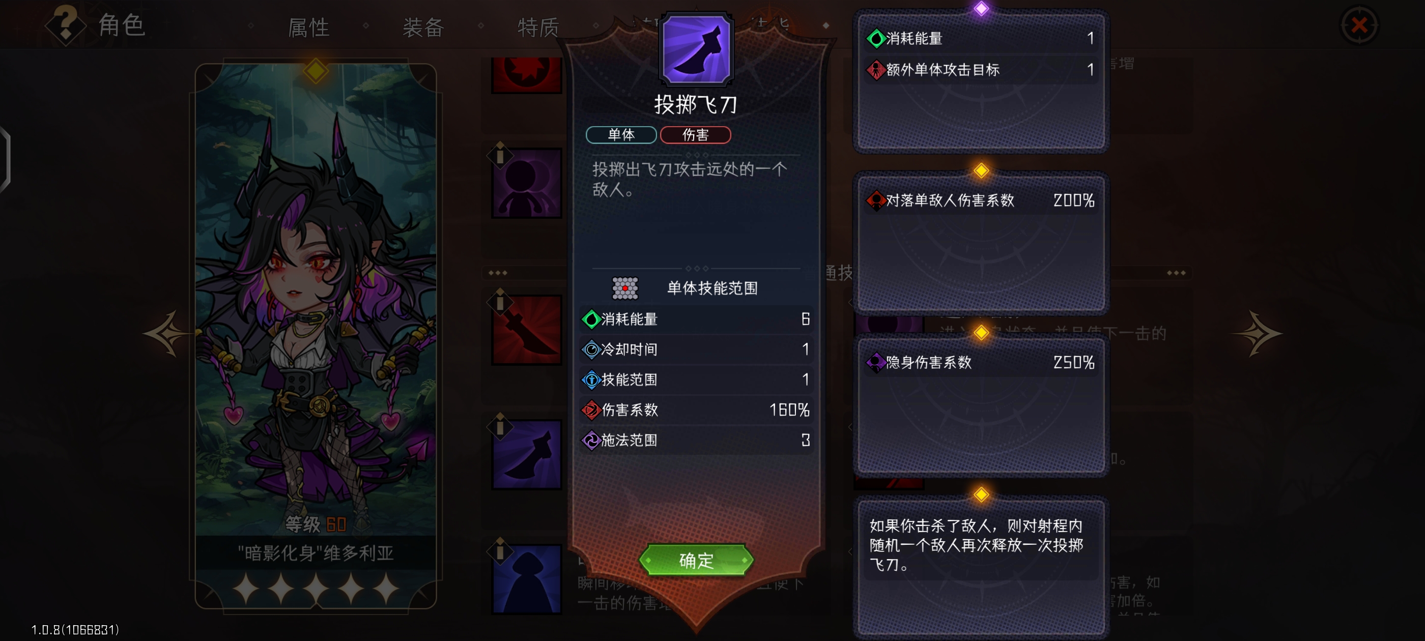 刺杀:25%生命以上视为满血>精英怪3倍伤>普通怪3倍伤>6回合冷却>加攻>普攻加伤>普攻次数+1>普攻减防>回能>杀人后各种增益>攻击次数+1>暴伤+130>冷却-1>队友击杀生效>隐身>其他。