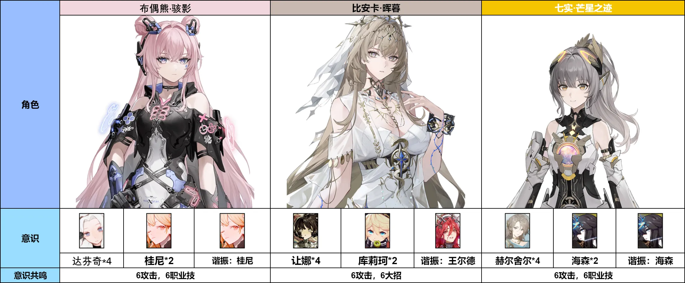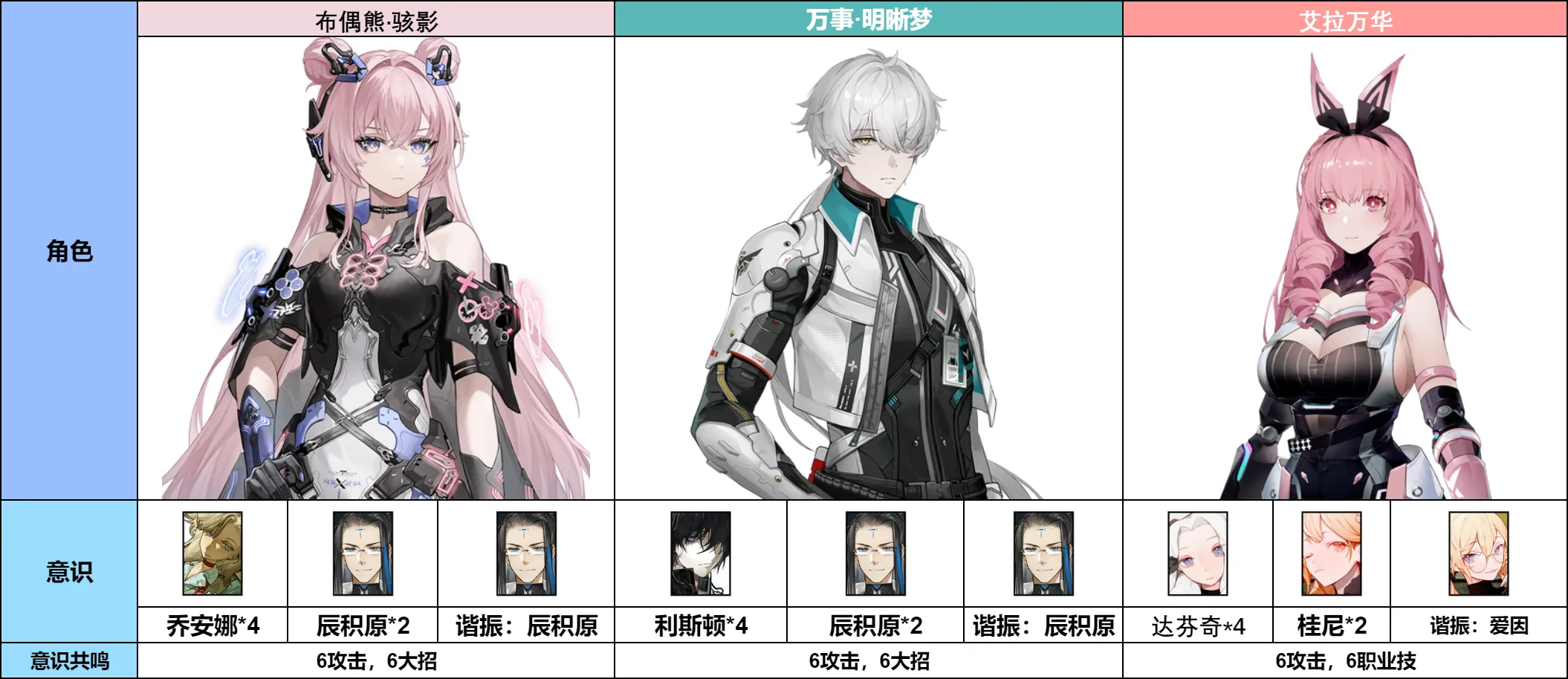 注意:本推荐仅为最通用情况下的意识搭配,实际情况中根据不同的流程场景可能有更优的意识搭配方法,具体可以参考正式服攻略。冰队跨波能力没有那么强,第三人带2桂尼2爱因上限比4桂尼高些,并且万华qte仅有单段治疗无法一次触发4桂尼效果。