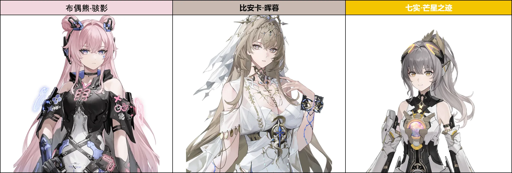布偶熊·骇影,冰属性增幅型,效应为熠光。虽然骇影是增幅型,但由于冰队主C启明是在岗时间较长的老同志了,输出能力偏弱,因此,骇影在新的冰队中,将暂时作为主C存在。而作为熠光效应的新成员,骇影是效应启动的定位,光队仍刚需比安卡·晖暮,才能有较好的输出能力。1. 常规搭配