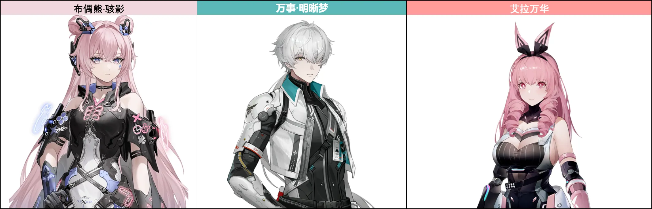 注意,在测试服版本中,骇影输出能力更高,是主C的定位。明晰梦作为副C,在战区等环境中可以与骇影进行双切输出,万华则作为提供buff的工具人使用,可以使用任意其他增幅角色进行替代。其中,使用SSS阶级及以上灼惘表现更优。