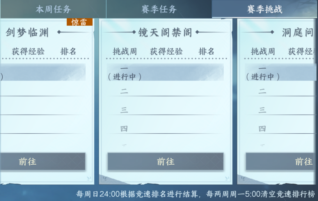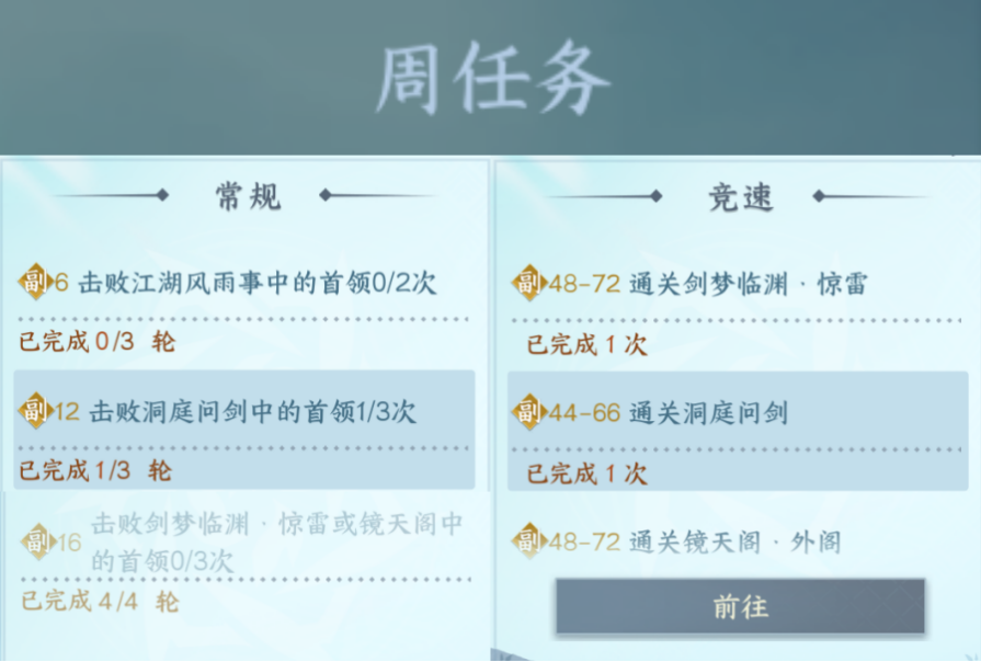 1.周任务常规就是清每周副本以及每日副本即可,竞速就是通关对应副本/江湖秘境,即可获得副本段位经验,每周有上限这周是600,如果不够江湖秘境大家每个图都打打就够了。