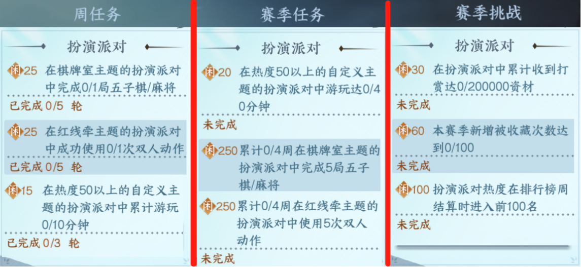 1.周任务在棋牌室主题的扮演派对中完成一局麻将/五子棋/5轮,红线牵主题完成双人动作/5轮,在热度50以上的派对玩10分钟/3轮。