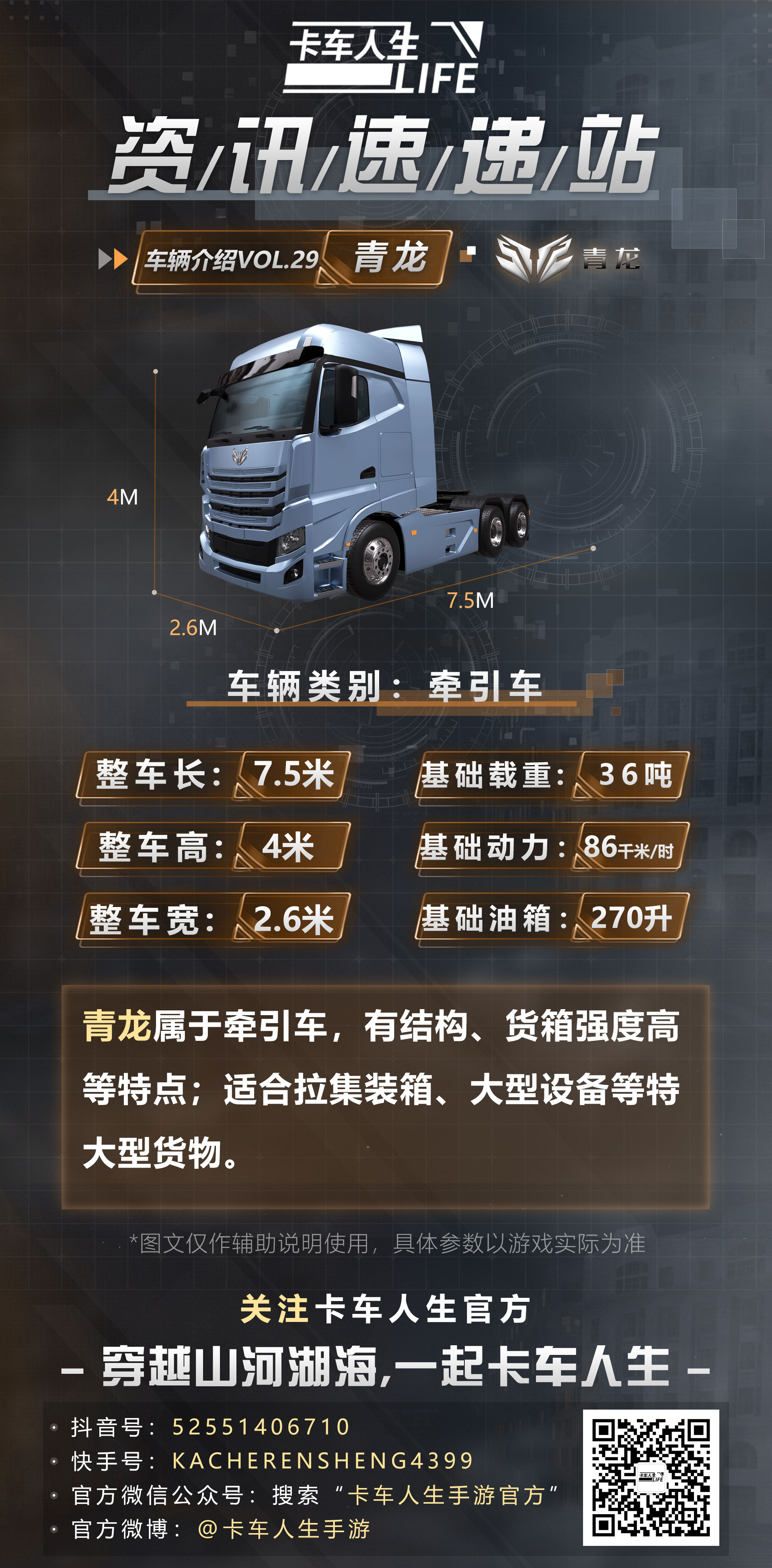 “青龙” 绝非传统大型货运卡车的平凡复刻,作为游戏牵引车矩阵中的亲锐拼图,适合中长途运输,尤其是在超载货物运输中显露无余。其不凡风度宛如传说中乘云驾雾的青龙,不动声色中蕴藏着磅礴力量。“青龙”不仅兼顾了高效运输与功能配备,更以其精密高超的制造工艺卓立于市场前列。青龙其重量大及车头与车厢灵活匹配的组合特性,每一趟货运都成为非凡经历,面临跨省跨区的使命不再受常规局限。