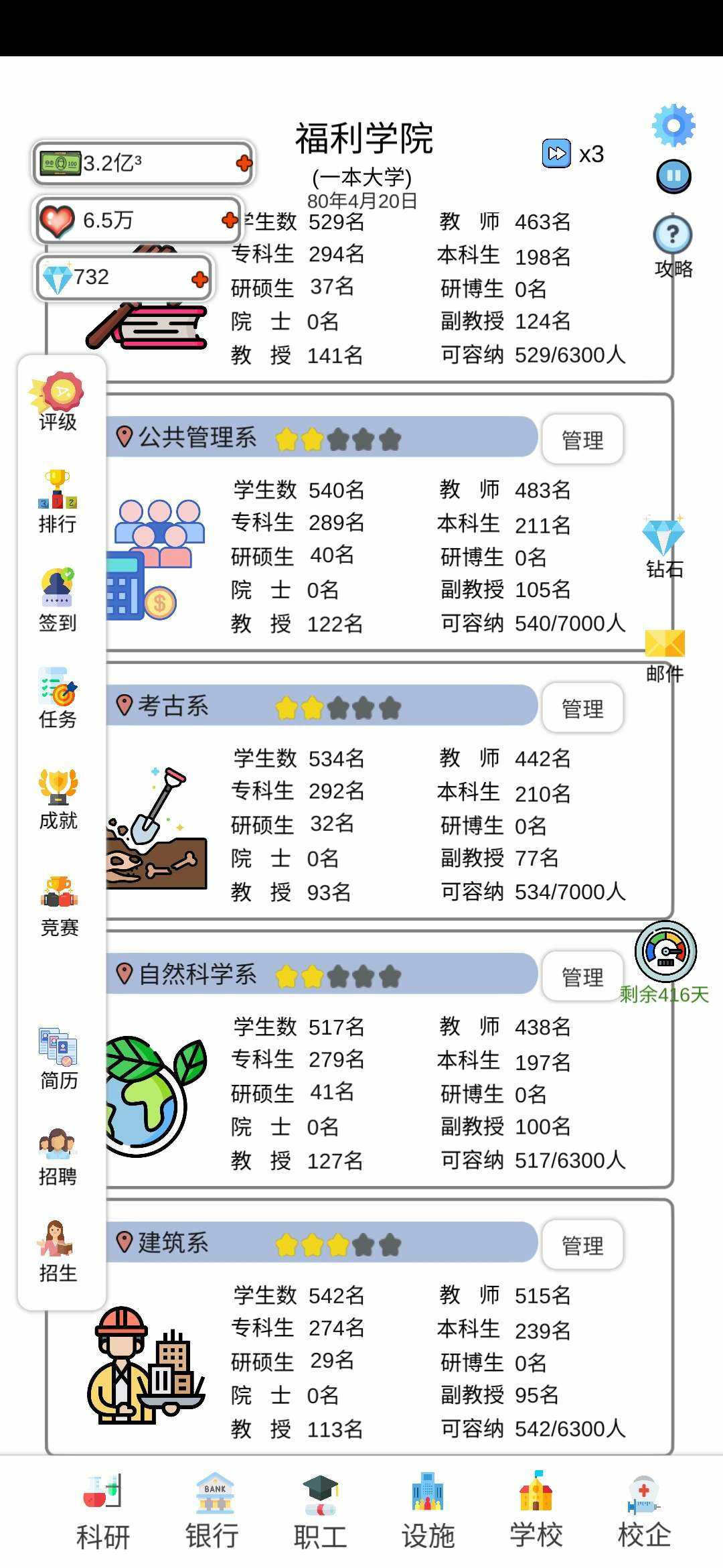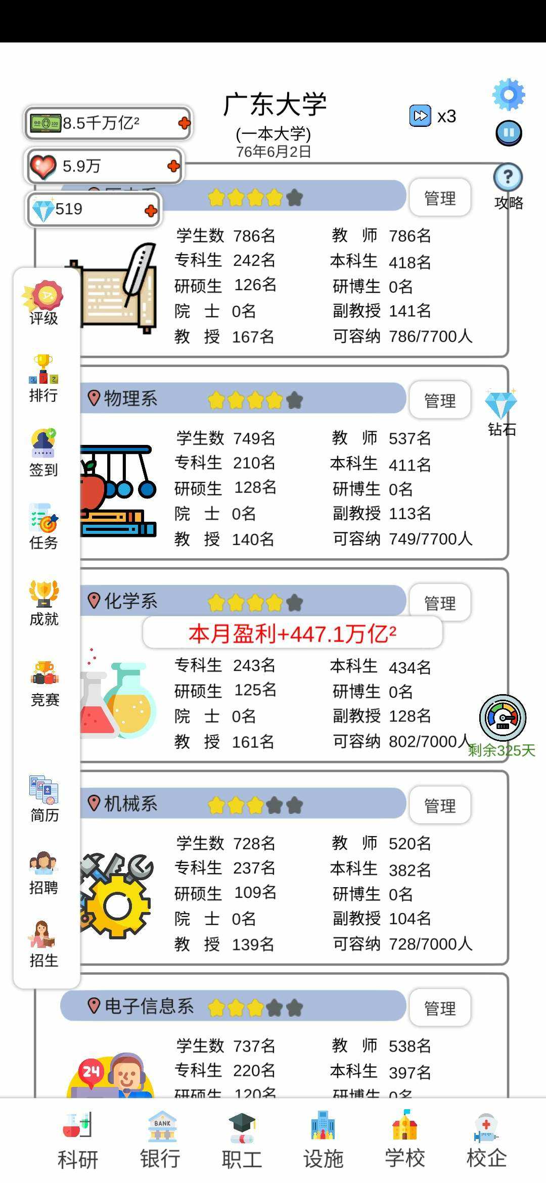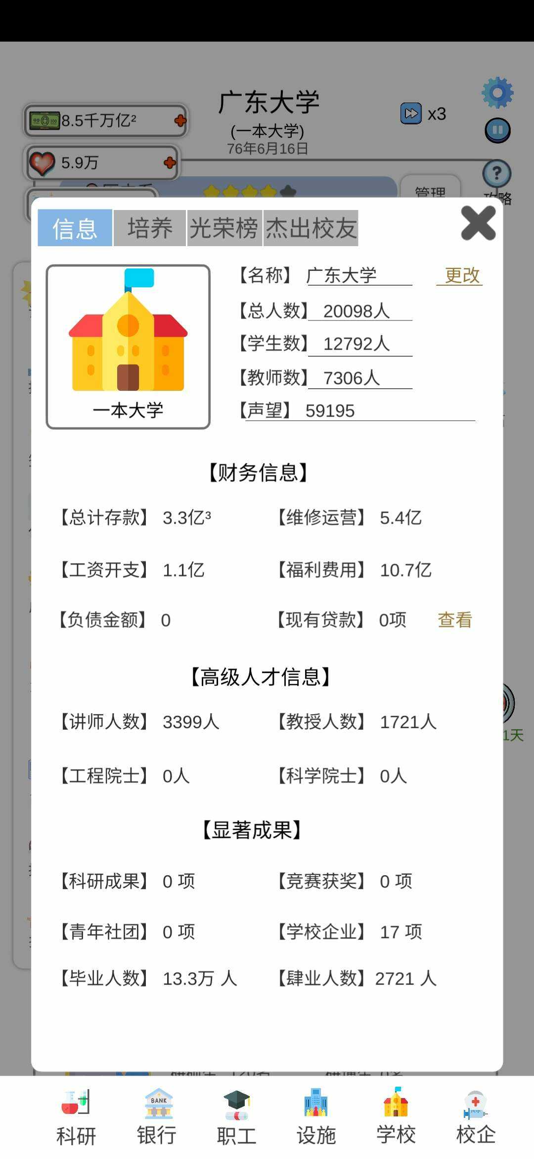 更新0.36 更新说明1.更新游戏BUG玩到后期卡顿问题。 游戏介绍收起一款真实的模拟大学题材的游戏!非常真实!请叫我校长是一款模拟经营我的大学题材类的游戏,在游戏里面你扮演着校长的角色,你的一言一行每一个决策都将影响学校的发展和走向,你除了要计划好每一笔资金的使用情况,还要保证学校能够持续良性的运行下去。开局你只是一个普通的专科学校,然后经过一系列猥琐发育,你终将成为国际性知名大学。