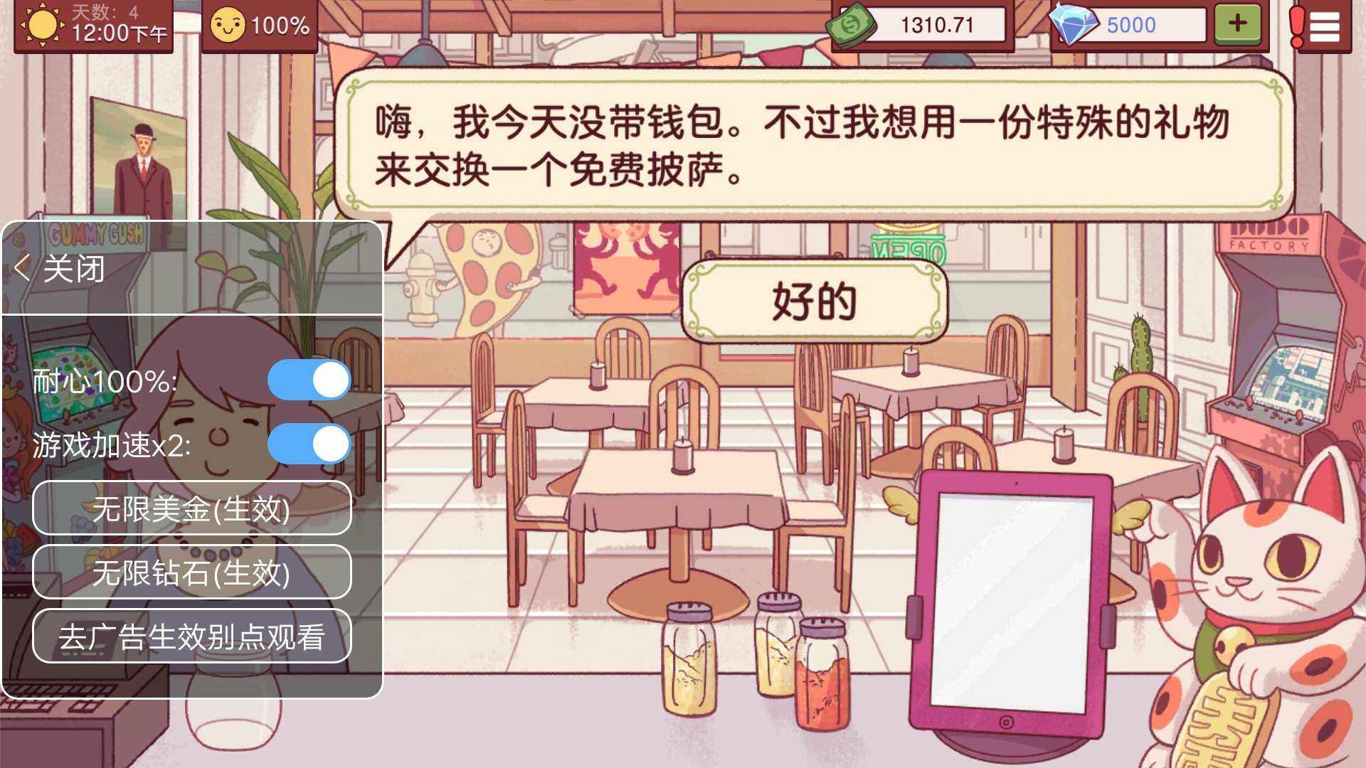 辅助菜单: 1.耐心100% 2.游戏加速×2 3.无限美金 4.**5.免广告获得奖励