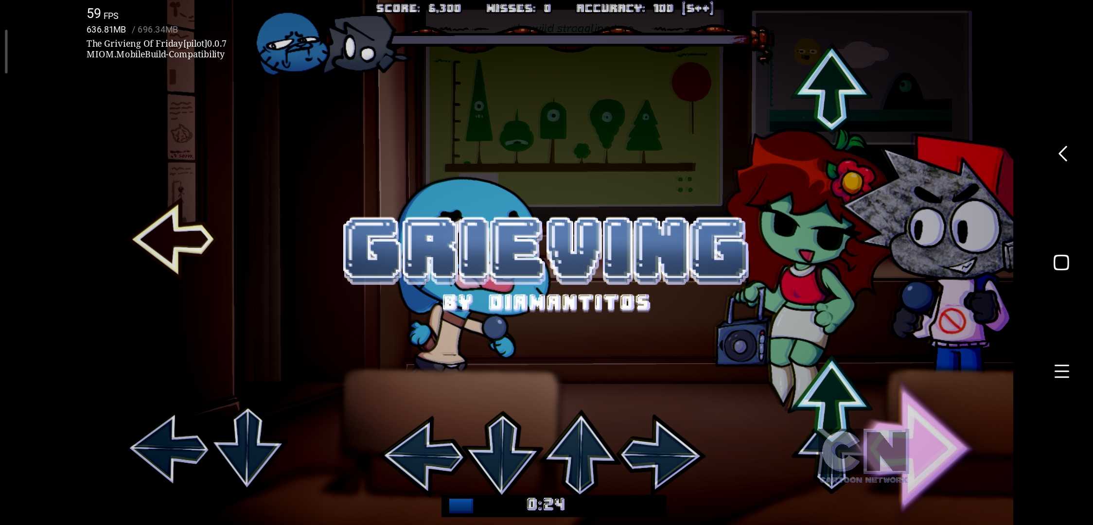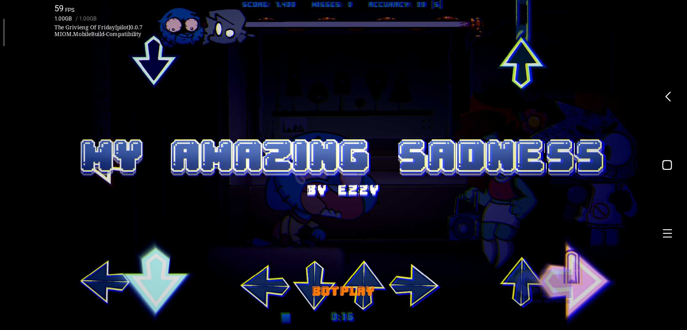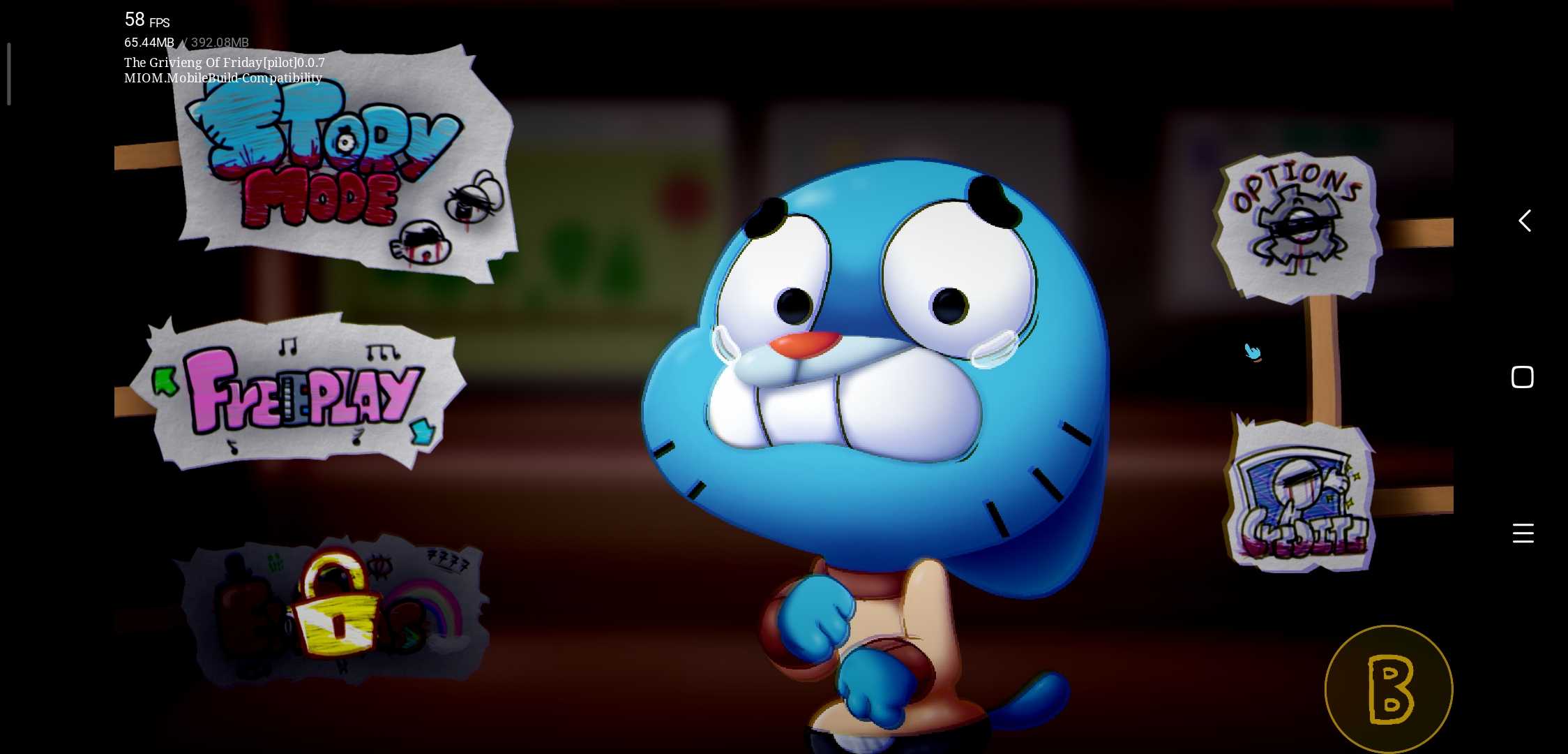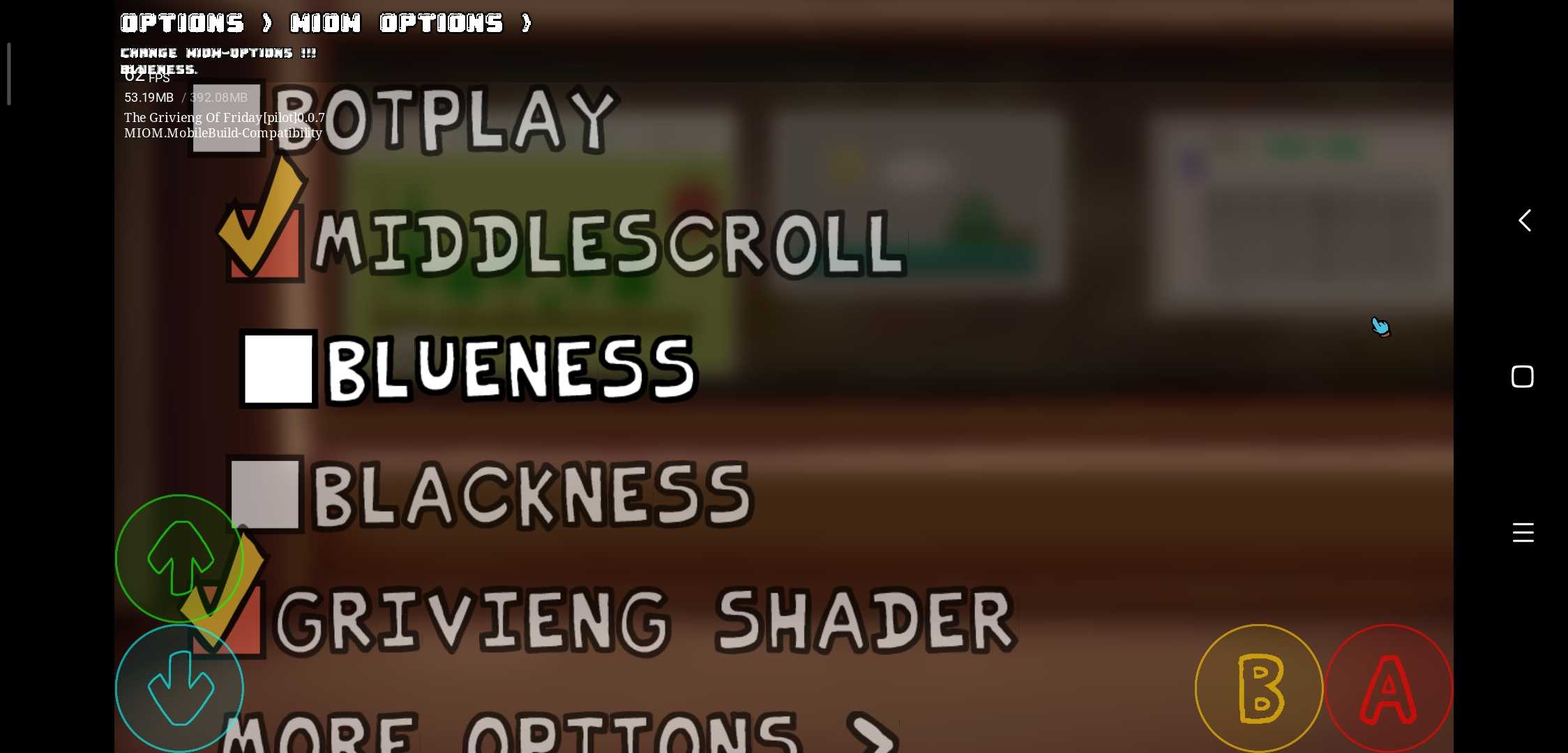 The Grivieng Of Friday [Pilot]-Build Compatibility 经过了这么多天,终于出了完美移植 修复了许多问题,我都成为传奇耐肝王了 这个版本为兼容版本,主要作用是能让大部分玩家的手机都能玩到,实际没什么区别 以下为一些细节更改事项 1.进入游戏默认打开主界面主周目着色器,居中按键,可以在MIOM Options 修改 2.关于以前为了代替着色器的Blueness blackness 他们俩仍然保留,但效果弱化,且默认不打开,我试了打开的话也可以。 3.关于曲目Clown Eyes 里面需要按空格的机制默认不打开,可以在MOD Options如果你们愿意的话,当然可以在安装包中找到虚拟键盘来代替空格,或者接蓝牙键盘。 这次所有的着色器都完美的移植过来了。 非常感谢ClaireDesignPro提供的GriviengShader着色器 以下是目前模组的功能 1.botplay和居中按键 原版cne是没有的 2.Blueness Blackness两者是我自己加的,可以增加氛围感(仅限主周目) 3.增加隐藏血条功能 4.还有一个好结局就不必多说了,自己去试吧 注意啊!如果你在使用居中滚动时出现bug 你可以在More Options 把强制居中滚动勾选上,只不过会去掉一些效果 2025.10.06 BY MIOM
