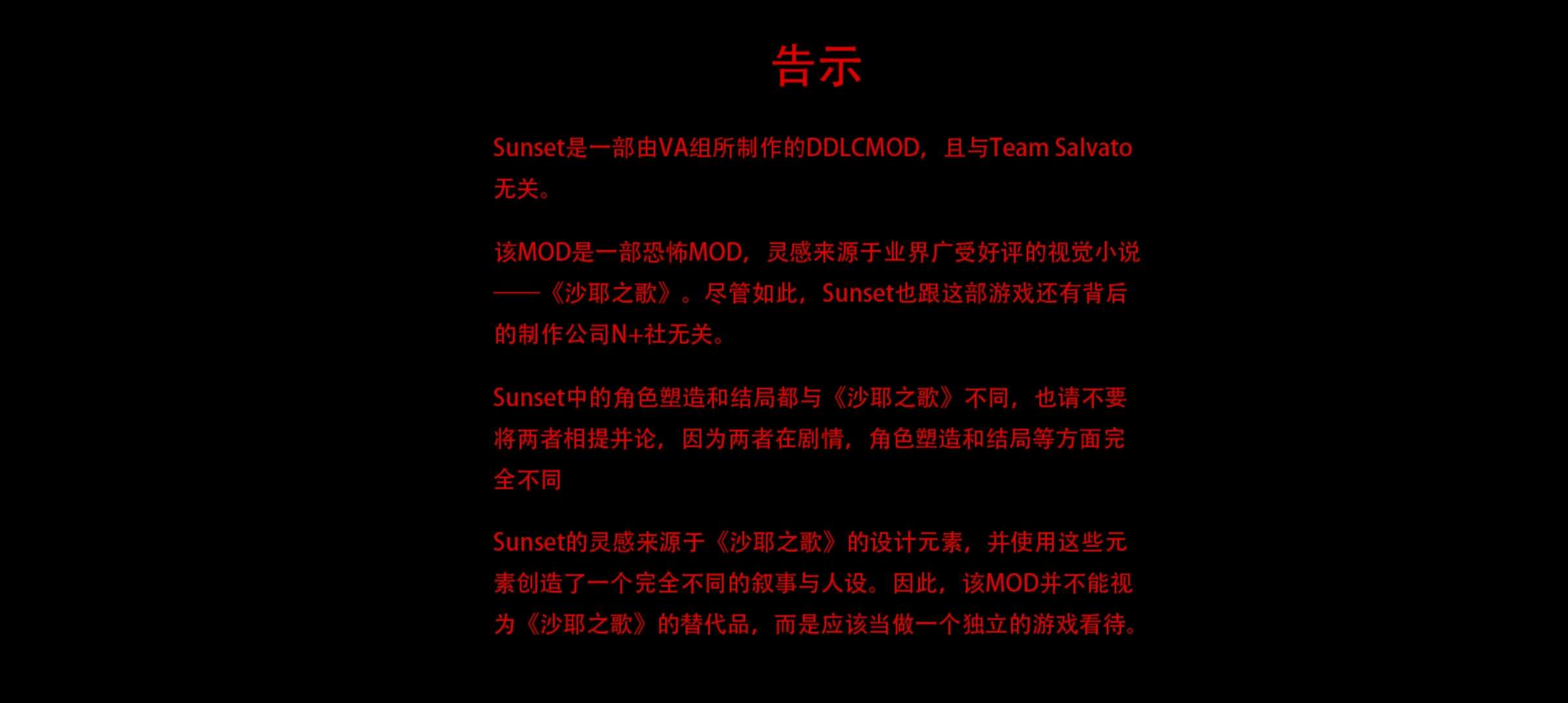 Sunset 汉化+润色:樱花 修图:纸心,樱花 移植:Batebri 技术:Batebri,樱花 篇幅:短 类型:恐怖 “黯淡无色,日薄西山。” “而你,惊心破胆。” “我的出现,尘埃落定。 “万事俱备,只欠东风。” 以沙耶之歌为灵感的Mod,故事的开始,文学部五人组在一个雷雨天在部室里看电影,这时突然停电了,有电工能力的MC提出了要去电箱看看解决。
