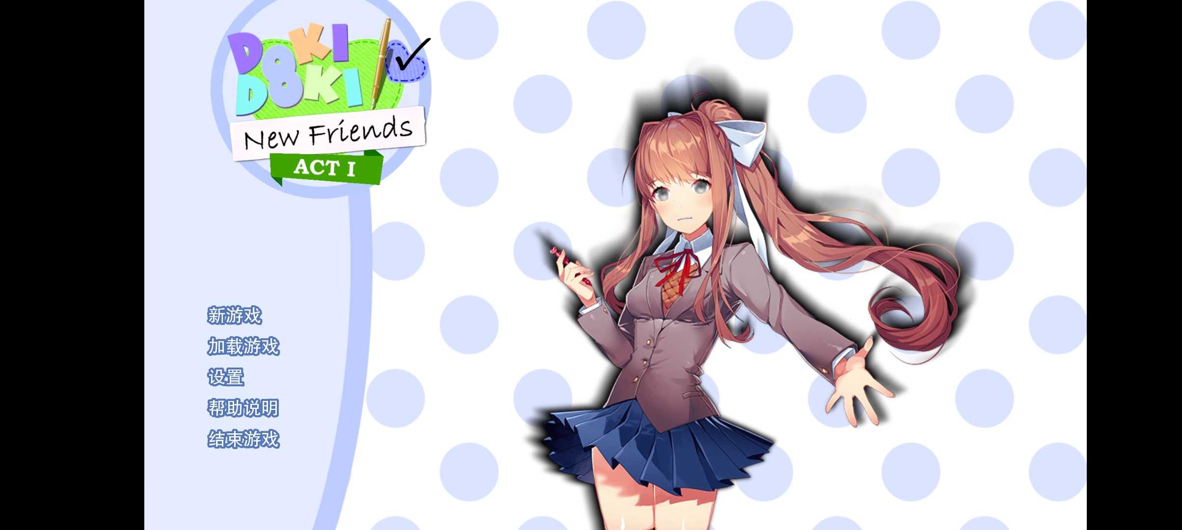 New Friends ACT 1 程序:allos 初翻:allos 校正:allos 测试:allos,GOLDkey 修图:纸心 移植:GOLDkey 角色向:莫向 本Mod讲的是一个关于莫妮卡的故事,在这个Mod里,她不会为“打破第四面墙”的问题而苦恼。相反,莫妮卡要克服强迫症和第二人格。她转到了一所新的学校,正如《新知》这个名字所暗示的那样,她必须结交新朋友了。我们将以莫妮卡的视角,看她如何克服心魔、交友以及维持友谊的。