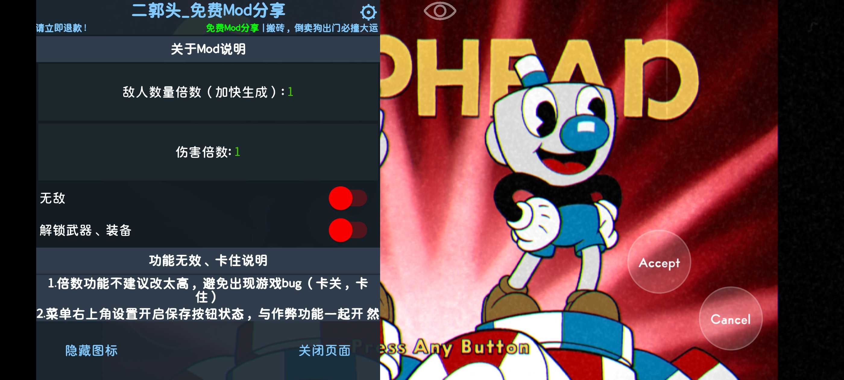 1.每次进入游戏隐藏按键,请点击屏幕上方中间的眼睛即可,按键即会显示出现 2.作弊失效问题有说明 3.出现Bug是游戏问题及作弊菜单问题 4.如果有Bug关闭菜单玩就好了