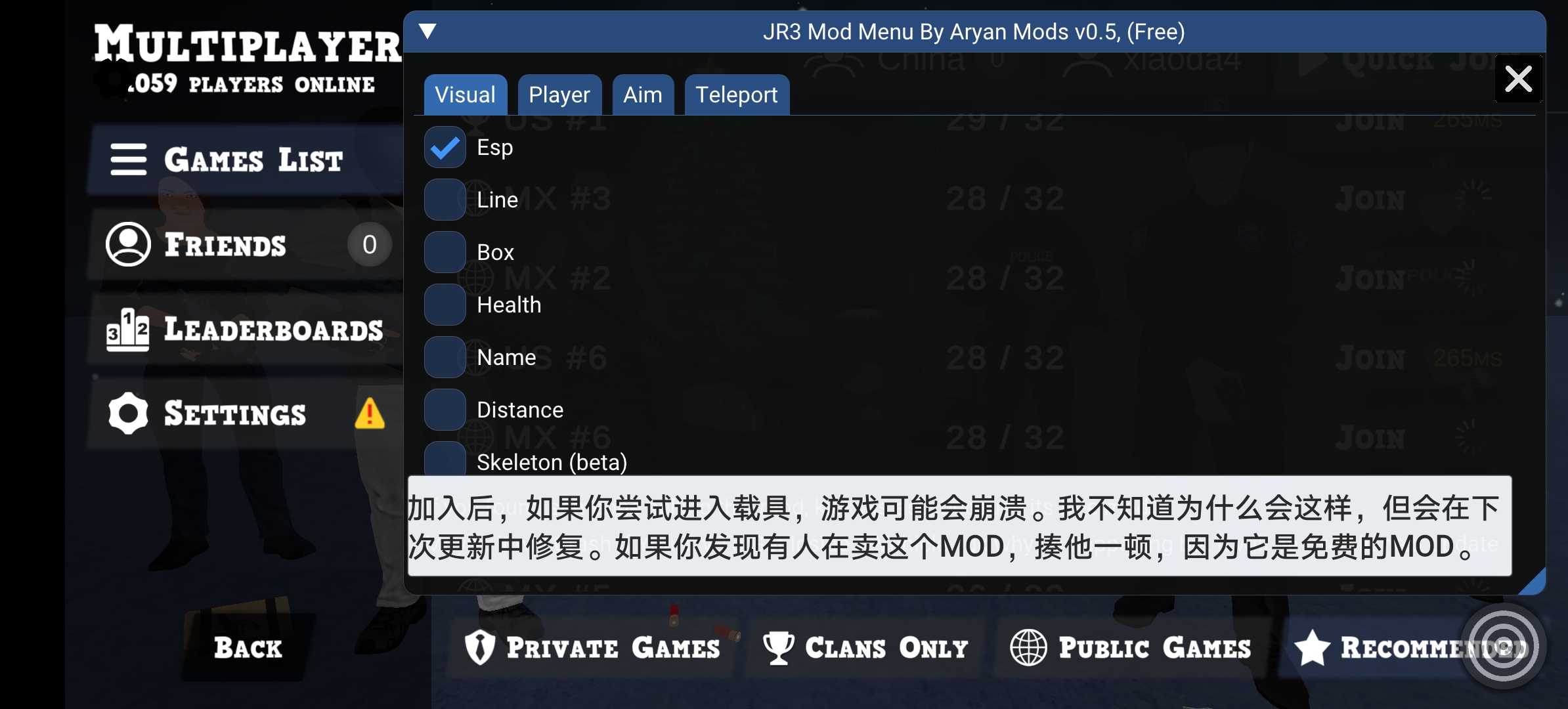 正义对决1.200f4版本最新版MOD 0.5外网菜单,,记得再点个赞,以下是介绍,对了,别忘了加群,我创建了一个群聊,群聊是第一张图片,自己看,想要更多免费MOD就加入我的群!!! 纯免费 点个收藏点个关注,点个关注不迷路,找找MOD就找我(本MOD是外网免费,我也不要钱,点个关注就行) 不定期更新 外网MOD介绍如下: ESP(具体不多介绍,简单来说,就是你开启之后会显示他们的颜色,还有他们账号数据,并且也可以看到他们的血量和他们距离和小方格) 第二个功能player 里面有三个功能: 1.try(翻译:尝试 该功能不建议在多人游戏中使用,但是在单人游戏中建议使用,这个功能简单来说,就是把所有武器价格,还有子弹啥的都给调到一元,并且劫**还能解锁警c的电击枪武器,如果开启后再次关闭,则会免费,但这只适合在单人模式开,在多人模式开别怪我,轻则被列入为外G账号,无法加油和其他反作B,重则直接f号,并且金钱可能会归零) 2.(翻译后是全穿 简单来说,就是同时开启了飞天遁地和穿墙,就算你到建筑物内也能可以穿,但是不过开启这个功能时,打人的时候伤害可能没有,或者是很低) 3.大头(简单来说,就是把所有玩家的头可调大调小,但是碰撞箱不变) 第二个功能(多人联机适用,但有3个不建议使用) 1.无后坐力(这个适用听我说的就是) 2.超级射速(这个不建议使用,虽然这个开启后不会被反作b检测到,但是不过伤害会被降到最低,甚至没有!不建议开,但是在单人模式随你便) 3.最大射中范围,搭配第3个子弹追踪,否则无法启动,自己探索吧 4.最大伤害(Up亲自测了一下,单人模式中有效,联机模式中无效,联机模式中建议别开) 5.固定子弹(有被踢风*建议有必要的时候开,没必要不要开,子弹到达五或者是五以上的时候会直接固定,但是有几率会被踢出) 第三个大功能是子弹追踪,这个我不太详细多说,你们自己用翻译器翻译 第四个是传送,需要先在地图上标记白色小点点,然后再点击传送,就可以传送到你想去的目的地,当然,逃跑也可以,单人模式中也可以用 (小提示:ESP开启后会有一定的风险闪退,原作者说,会在下一个版本更新中修复,所以请耐心等待!!!)