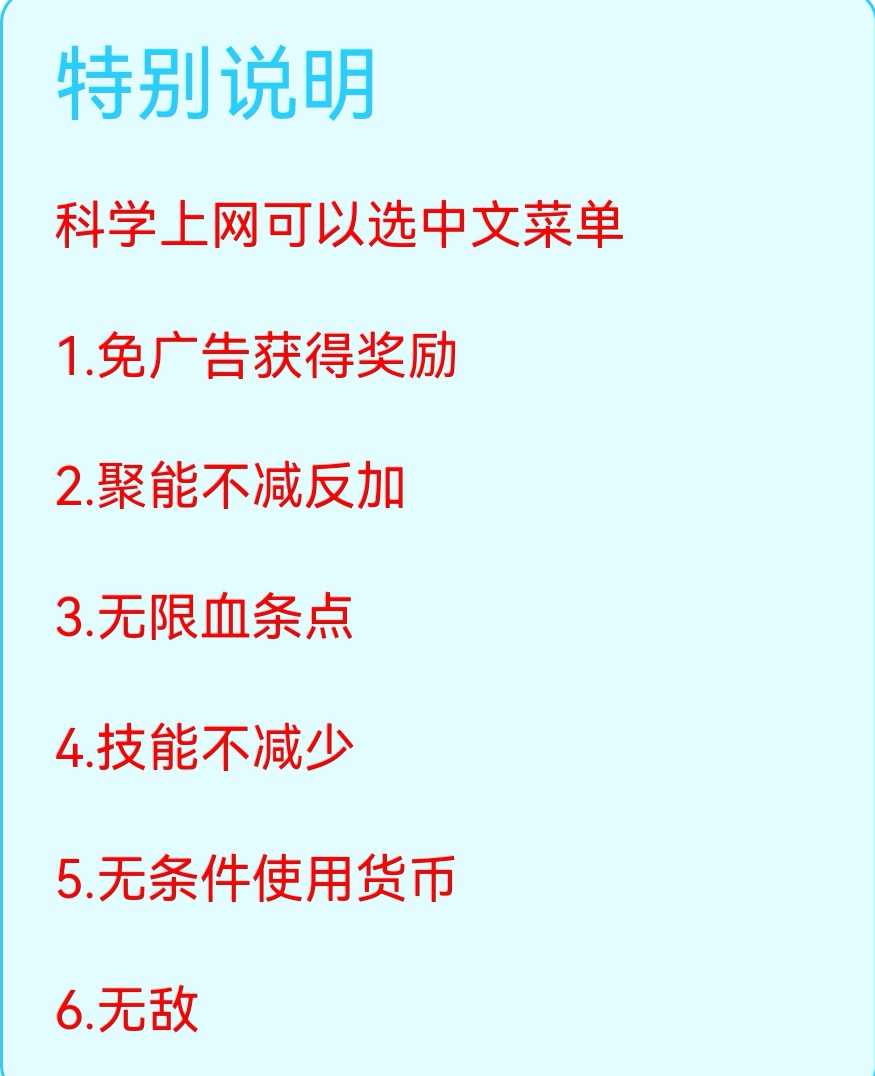 特别说明 中文菜单 1.免广告获得奖励 2.聚能不减反加 3.无限血条点 4.技能不减少 5.无条件使用货币 6.无敌