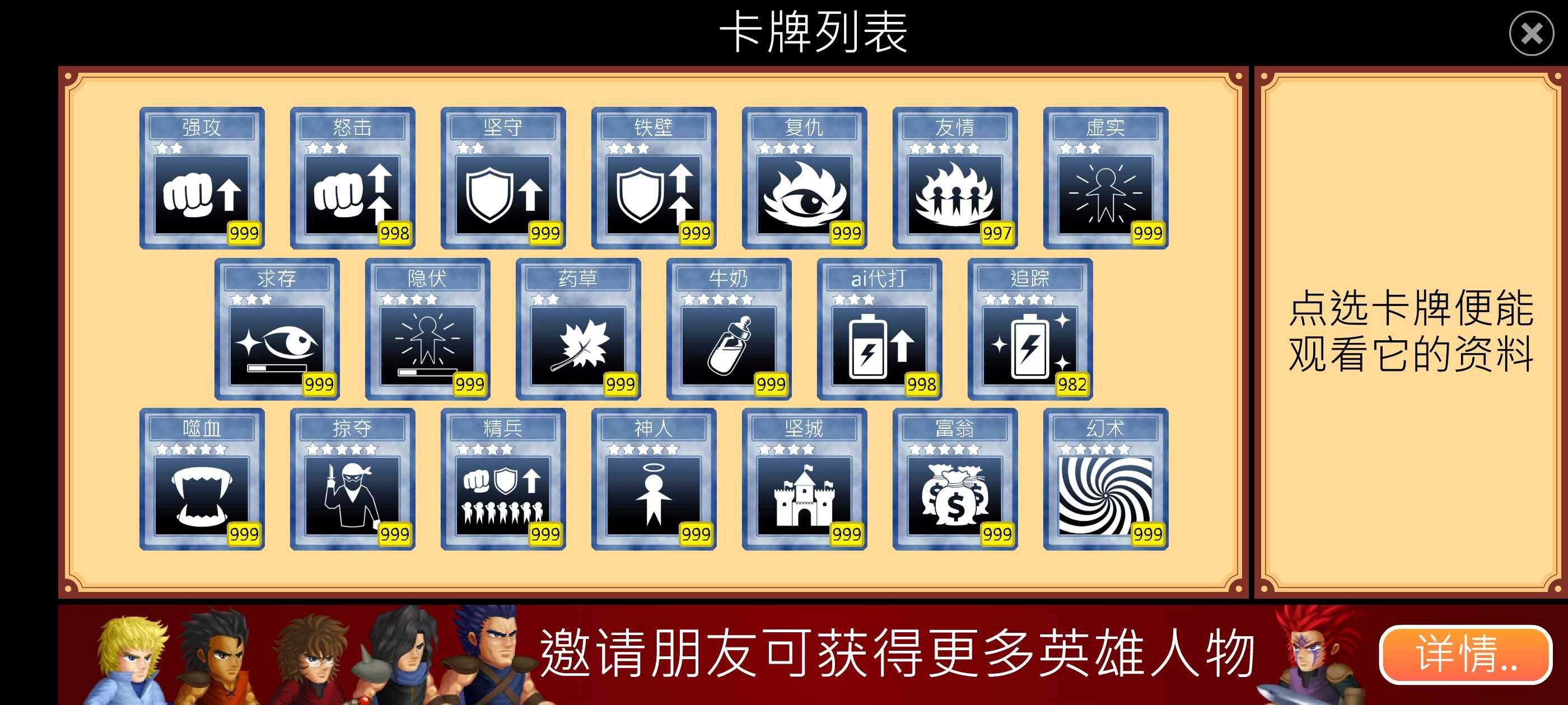 1.全英雄了通关获得 2.全部卡牌在基础进行了强化,并新增两张全新卡牌 3.战争兵种拓展 4.全英雄五倍血量,无限蓝量 5.无限卡牌 6.等级平衡 7.兼容安卓