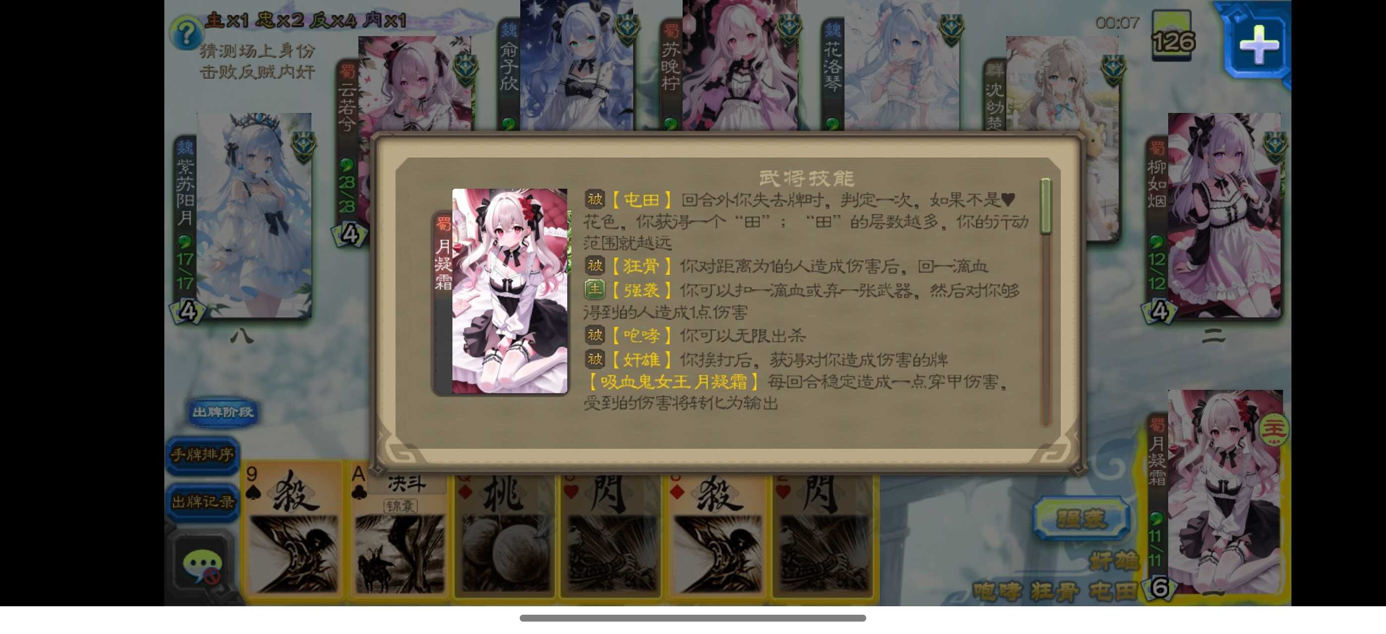 小更新,新增两个角色:校花 柳如烟,吸血鬼女王 月凝霜,明天下午之前会出正式版,更新6~8个角色,背景音乐换新,为“魔王原生”系列角色设计全新专属语音 三国杀全新二次元版本,云生筱梦版本的续作。 延续云生筱梦版本的二次元风格,移除男生角色,现拥有28个女生角色,以后也只会更新女生角色 UI改为蓝色、更养眼 优化背景音乐,选曲标准以能让人心情愉悦的歌曲为主,并应用最新、听感最佳的内嵌音效,音乐曲目扩容至4首,且每次大更新时都会换新背景音乐 游戏平衡性加强,身份场模式全优化 目前还处于公开测试阶段,下载人数达到预期的话,才会更新正式版。 正式版将会优化角色卡牌语音,在原有的女生卡牌语音基础上,另外为“魔王原生”系列角色设计全新的女生卡牌语音 关于游戏平衡的改进(比如哪个角色过于超标)、对更新内容有哪些期待 欢迎留言讨论