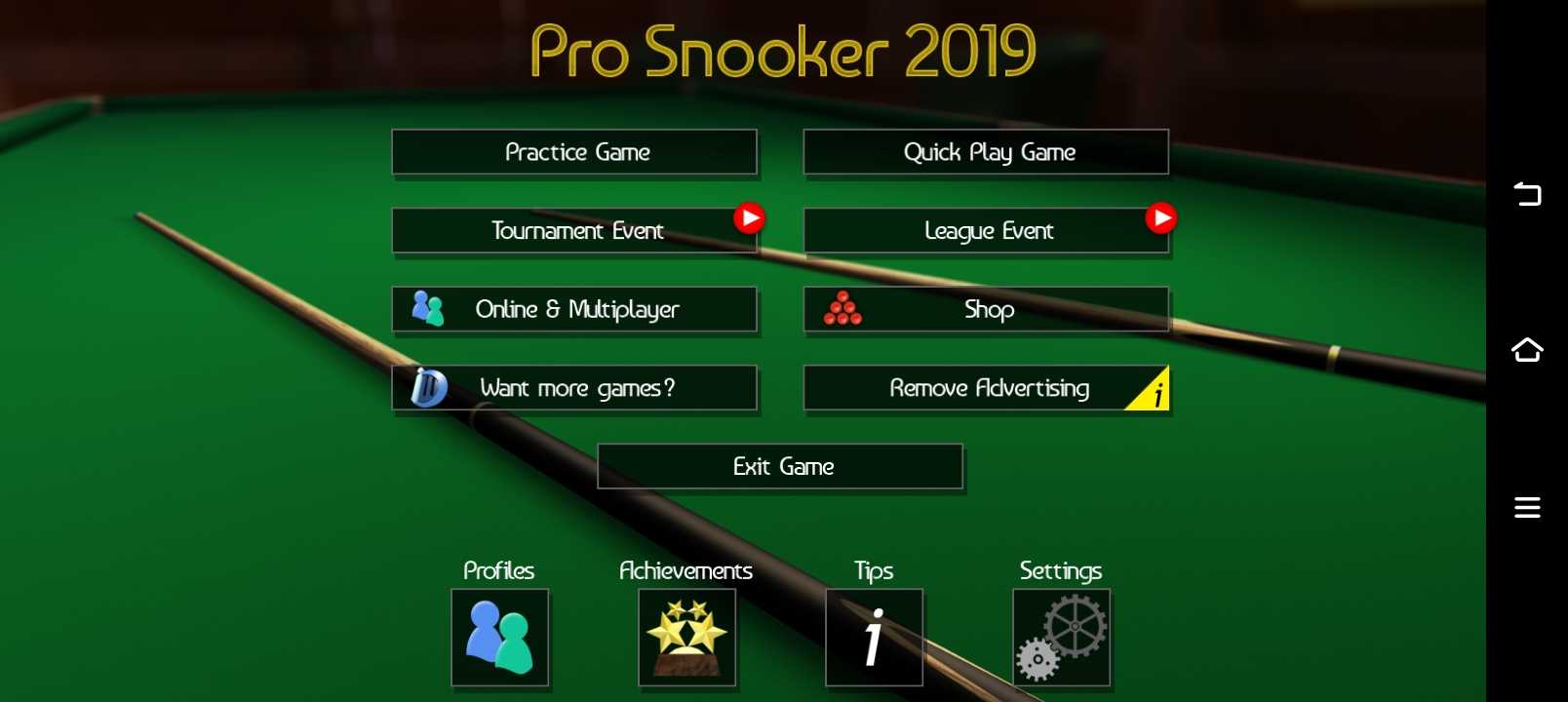 随着其体育游戏的全球成功,iWare Designs为您带来了Pro Snooker 2019,可能是移动设备上最现实,最可玩的斯诺克和台球游戏之一。拥有完全纹理的游戏环境和完整的3D刚体物理,这款游戏是休闲和严肃游戏玩家的完整套餐。 简单的点击和播放界面允许您快速拿起和玩游戏,或者对于更严肃的玩家,游戏包括提示球控制,允许您执行更高级的镜头,包括后旋,顶旋,左旋(左英语) ,右旋(右英)和球转。 因此,无论您想要一款简单轻松有趣的斯诺克游戏还是完整的模拟游戏,这款游戏都适合您。