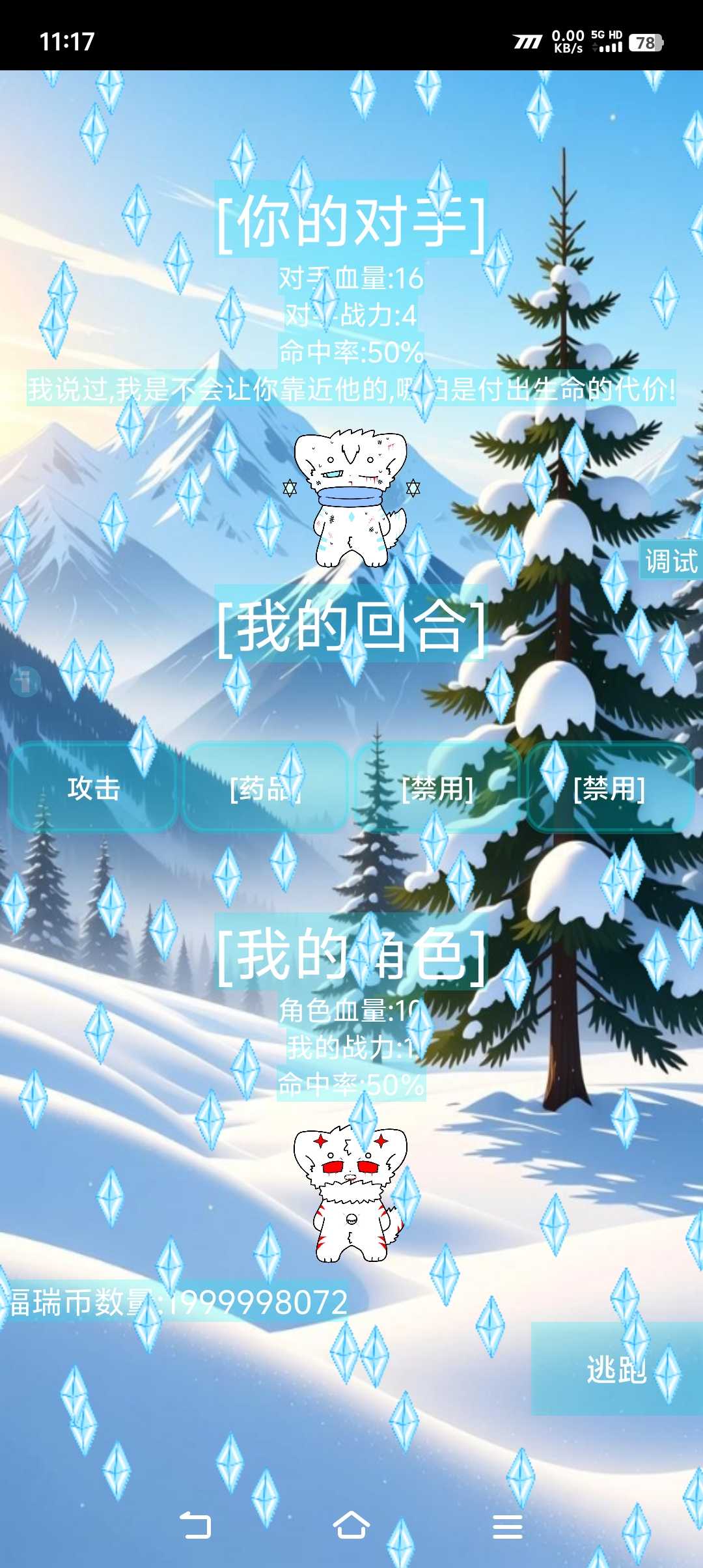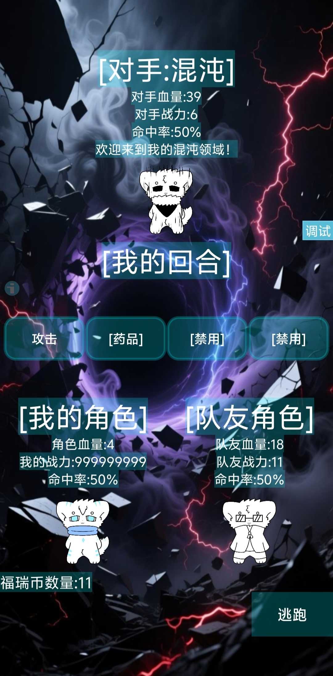 [游戏介绍]:这是一款由作者独立开发的自制回合制角色扮演赌运游戏,一个靠运气、血量、装备、战力战胜对手赢得奖励的回合制游戏,玩家不仅需要在战斗中靠运气躲避对手的攻击,也要靠丰富的战斗资质战胜对手赢得奖励...... [更新内容] 版本lv1.36更新内容 新增技能机制,新的技能书:燃:恢复,[目前只能在匹配对战中使用],更新兑换码和兑换码礼包(新手礼包),新增小白初始角色[获取方式]兑换码兑换,注:目前小白只能在匹配模式中使用